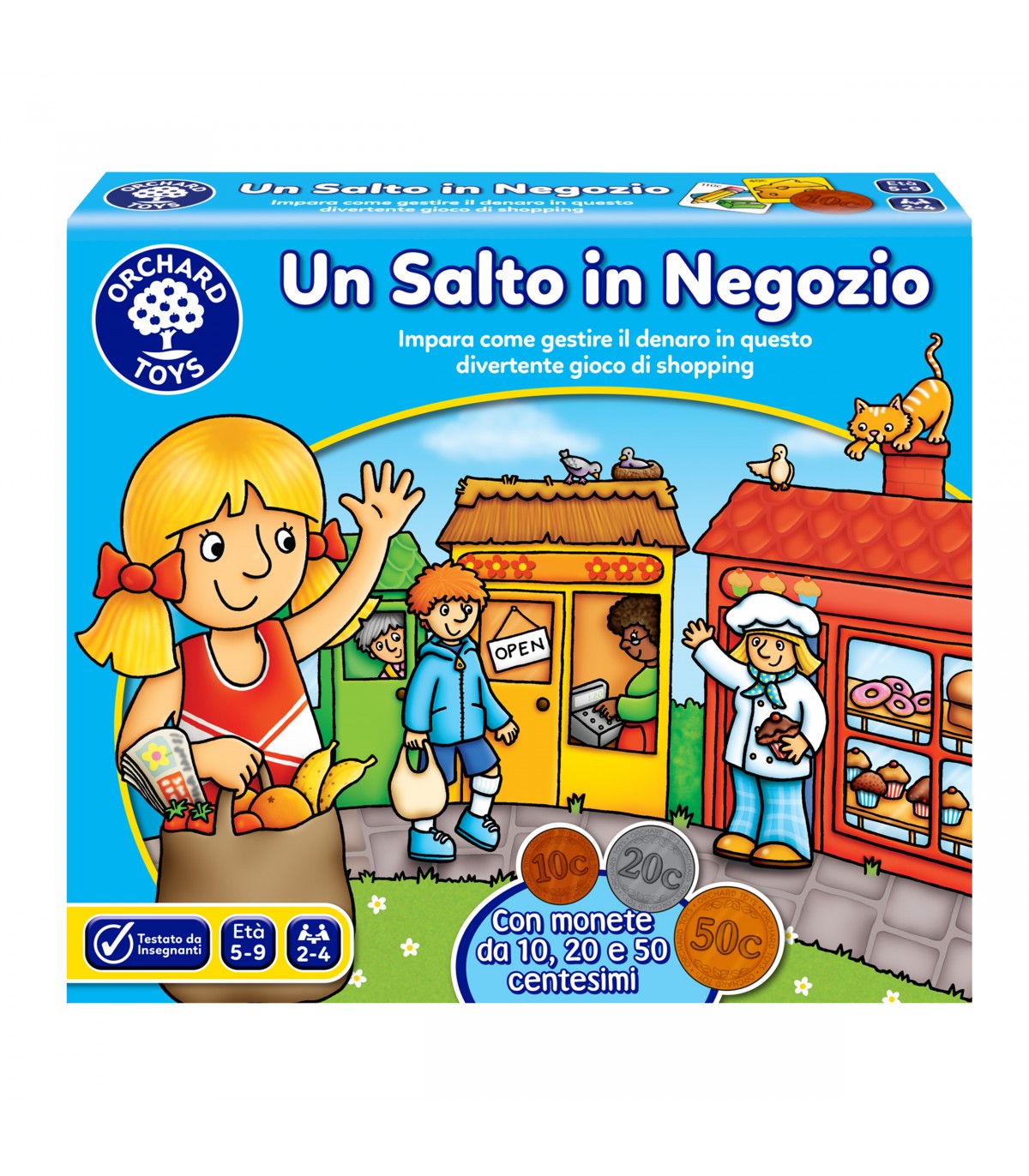 In questo gioco dovrai muovere il tuo personaggio da un negozio all'altro per fare acquisti, usando soldi finti per acquistare tanti oggetti diversi! Il vincitore è il primo giocatore che completa la propria plancia con 6 oggetti. Questo divertente gioco da tavolo Orchard Toys offre ai bambini un po' più grandi un gameplay più lungo e vario rispetto ad alcuni dei nostri tradizionali giochi di abbinamento e memoria. Grazie a Un Salto in Negozio i bambini impareranno a gestire il denaro e dare il resto, oltre a sviluppare la loro immaginazione mentre assumono i ruoli di negoziante e cliente. Il gioco incoraggia anche le buone maniere, poiché i giocatori dovranno dire per favore e grazie al negoziante o al cliente ogni volta che acquistano un oggetto. Il tabellone presenta negozi ed oggetti con cui anche i bambini piccoli avranno familiarità. Contenuto: 1 tabellone da gioco componibile 48 tessere oggetto 4 plance borsa della spesa 4 personaggi 4 basette per personaggio 1 plancia di monete da defustellare 1 dado 1 foglio di istruzioni