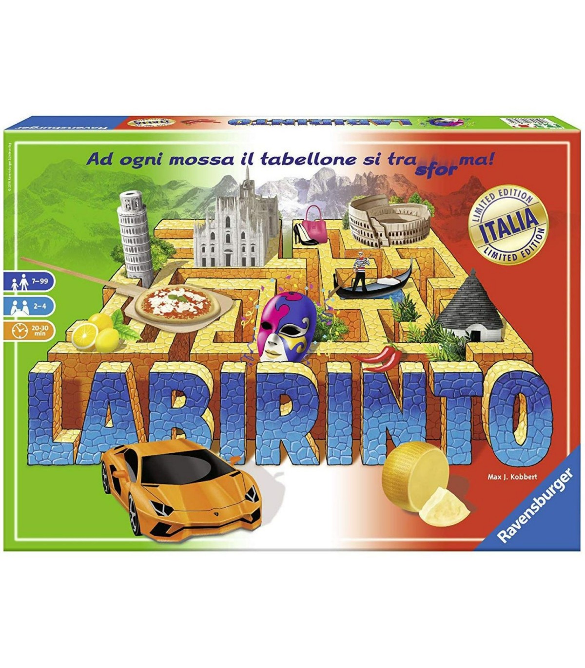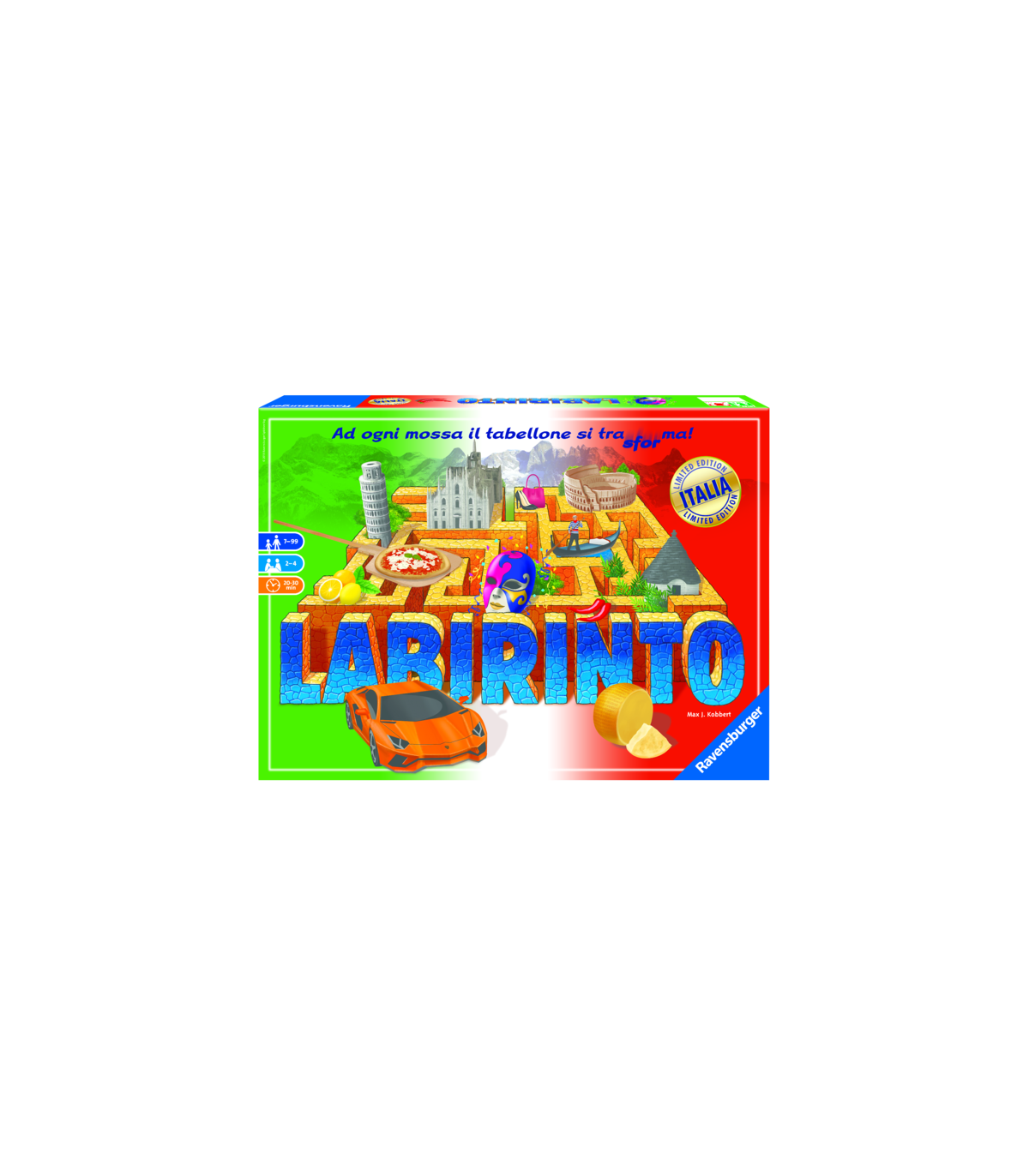 Labirinto Italia è una versione di Labirinto magico interamente dedicata all'Italia Labirinto Magico è uno dei grandi classici giochi da tavolo Ravensburger e continua a far divertire intere generazioni di famiglie, adulti, bambini e ragazzi. Il gioco è per 2-4 giocatori che si sfidano alla caccia ai tesori tra le mura del Labirinto e vanno alla ricerca dei tesori nascosti del patrimonio culturale, gastronomico e architettonico italiano ad ogni mossa il tabellone del Labirinto si trasforma, ma le regole per giocare sono semplici: vince chi per primo raggiunge i propri tesori obiettivo. Ottima qualità dei materiali il gioco contiene: 1 tabellone, 34 tessere del labirinto, 24 carte del tesoro, 4 pedine. Labirinto Italia è un gioco per bambini a partire dai 7 anni, sviluppa la capacità di concentrazione e pensiero logico, inoltre promuove le eccellenze italiane in un viaggio tra architettura, gastronomia, geografia, motori, tradizioni, folclore e molti altri tesori da cercare.