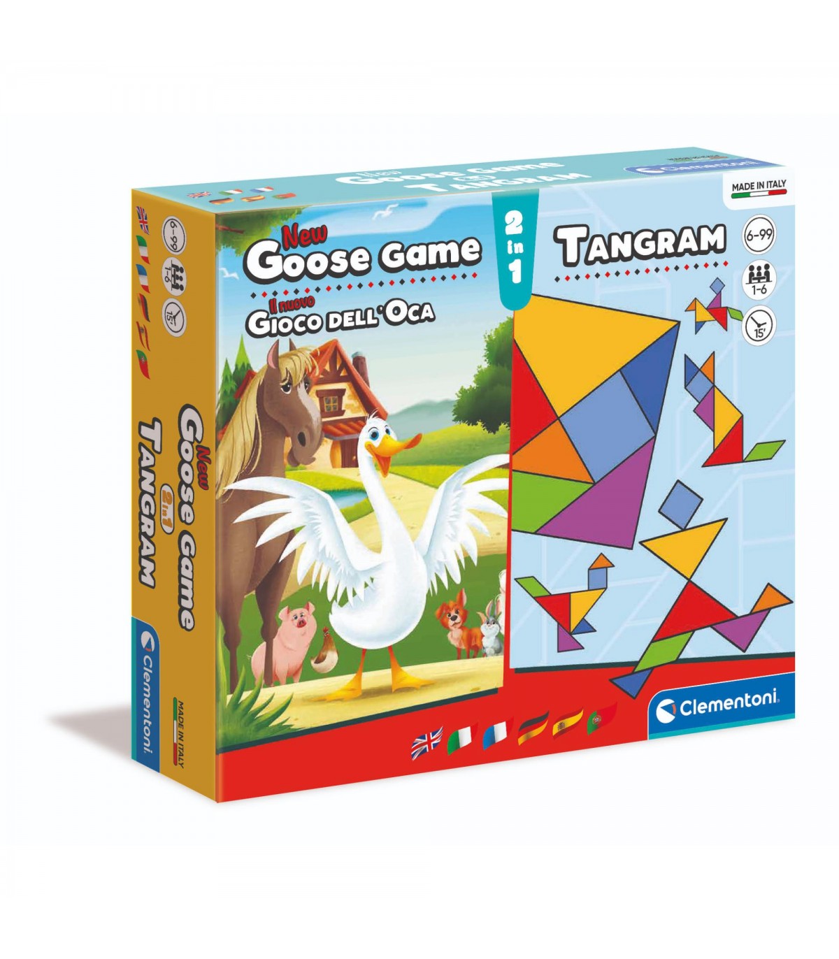 Due giochi in uno e il divertimento raddoppia! Uno speciale set con il nuovo gioco dell'oca e il tangram per divertirsi in compagnia di parenti e amici. Nel gioco del tangram tante tessere di diverse forme e dimensioni da comporre per formare delle figure, sviluppando la capacità di osservazione e la creatività. Un classico dei giochi da tavola, il nuovo gioco dell'oca torna con una dinamica rivisitata che rende il gioco ancora più coinvolgente, per lanciarsi in sfide appassionanti. Nel nuovo gioco dell'oca ogni giocatore ha 3 pedine a disposizione e lanciando il dado può decidere di volta in volta quale muovere per raggiungere il traguardo per primo.