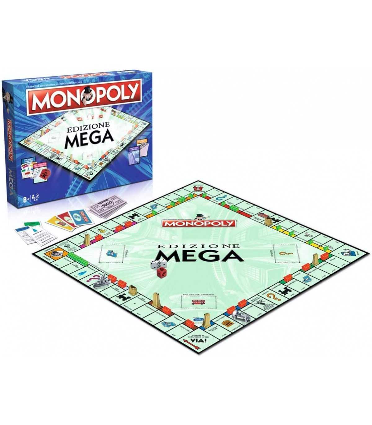 Compra più proprietà, compra più edifici e gestisci più denaro in questa Edizione Mega del gioco da tavolo più amato dalle famiglie di tutto il mondo. Il tabellone gigantesco ha 12 caselle extra, tra cui 8 nuove strade - una per ogni colore. Ci sono anche i grattacieli che potrai aggiungere alle tue strade, così gli affitti saliranno alle stelle e se costruirai i depositi nelle tue stazioni guadagnerai il doppio! La speciale banconota da M1000 renderà possibile pagare tutto questo. Dovrai gareggiare su un tabellone più grande e potrai aiutarti con Biglietti dell'Autobus e Dado ad Altà Velocità. Monopoly: Edizione Mega è facile e veloce da giocare e offre nuove opportunità e maggiori rischi!