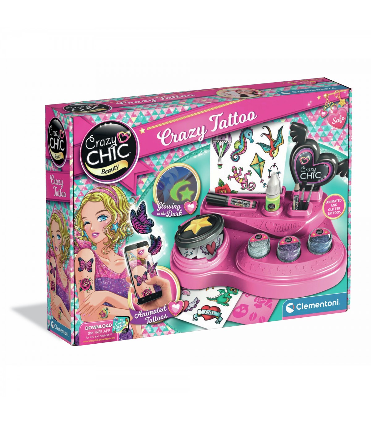 Per le fan dei tatuaggi è arrivato un kit super cool per realizzare tattoo trendy dai colori brillanti e dall'effetto glow in the dark. Grazie al pratico banchetto con tantissimi accessori sarà davvero facile dare spazio alla fantasia e alla creatività. Il prodotto contiene stencil adesivi, glitter colorati e colorante per il corpo effetto Glow in the Dark. In esclusiva per tutte le Crazy girls nel banchetto ci sono anche tanti fantastici tattoo con realtà aumentata. Con la Crazy Tattoo App, i tatuaggi diventano magicamente tridimensionali. Puoi fotografarli, personalizzarli e soprattutto condividerli con le amiche attraverso i canali social più trendy!