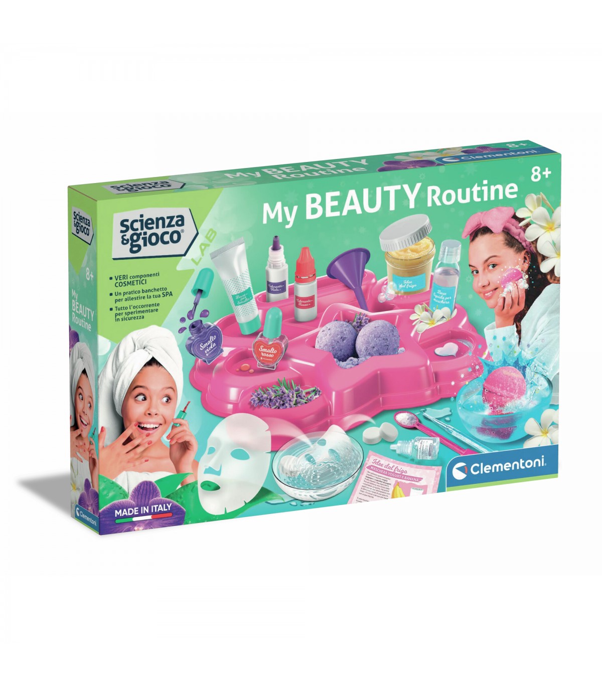 Con questo nuovo kit è possibile allestire la propria spa personale e dare il via alla sperimentazione cosmetica! Realizza maschere idratanti e bombe da bagno frizzanti e colorate da sciogliere in acqua. Contiene anche un pratico banchetto per le tue creazioni. Crea i tuoi smalti colorati per decorare le unghie e completare così al meglio il percorso di benessere. Un gioco per imparare a prendersi cura di sé e apprendere i principi della cosmetica! Ideato, progettato e sviluppato in Italia