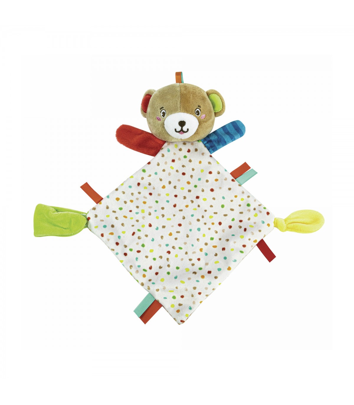 Un tenero orsetto comforter da portare sempre con sè, per sentire l'odore della mamma anche quando non c'è. Una manina del dolce orsetto diventa anche un pratico porta ciuccio. La mamma potrà lasciare il proprio odore sul peluche, che accompagnerà il bambino durante la giornata, diventando il suo perfetto compagno di nanna e giochi. La scelta dei tessuti è frutto di un'attenta ricerca, per garantire la massima qualità e sicurezza durante il gioco. 100% lavabile in lavatrice.