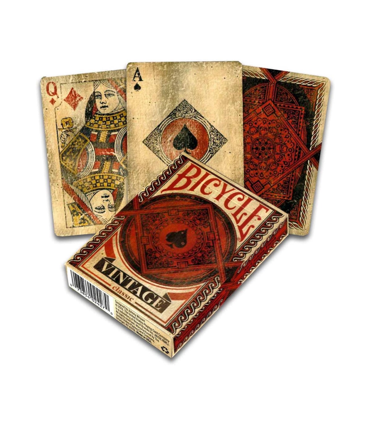 Ti piacerebbe mostrare ai tuoi amici o al pubblico un mazzo estremamente vecchio e logoro che è nuovo di zecca? Saranno affascinati!Ecco le carte da gioco Bicycle Vintage Classic! Questo mazzo di carte da gioco sembra essere stato rinchiuso per quasi un secolo, in attesa che qualcuno arrivi e lo riscopra. L'involucro intricato è invecchiato magnificamente mentre l'astuccio è ingiallito, ma il rosso ha mantenuto il suo colore vibrante nel corso degli anni. Questo mazzo di carte da gioco è stampato da Bicycle e prodotto da Collectable Playing Cards.Le carte da gioco Bicycle sono in circolazione da molto tempo, ma mai prima d'ora c'era un design così meravigliosamente realizzato e semplicistico che ritraesse il modo in cui erano le carte. L'emblema del mazzo Bicycle Vintage sembra assomigliare a una società segreta dei vecchi tempi, con la vanga come simbolo.Gli assi sono invecchiati un sacco, ma puoi ancora distinguere l'incredibile opera d'arte.Le figure