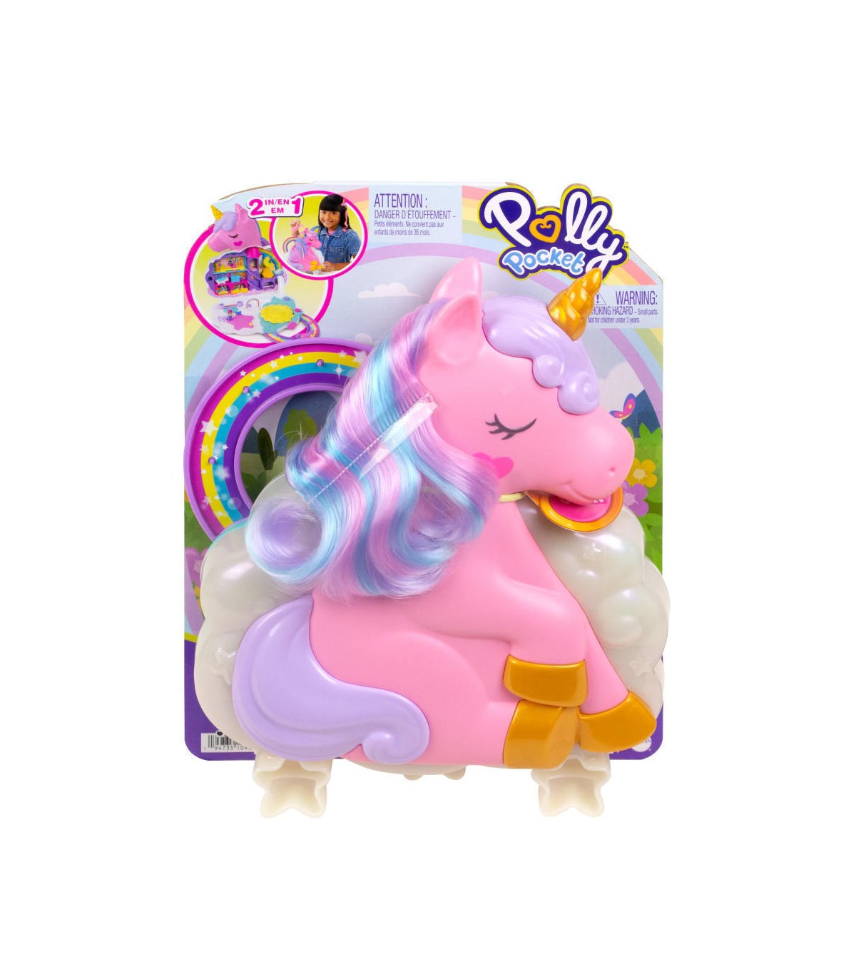 TRADE QUOTE SHEET COPY ONLY. NAMES AND PRODUCTS SUBJECT TO CHANGE. PENDING FINAL APPROVAL. Preparati al divertimento con il Salone di Bellezza Unicorno Arcobaleno Polly Pocket! Perfetto per giocare a casa o in viaggio, questo grande cofanetto ha la forma di un unicorno con una splendida criniera arcobaleno da acconciare con cui i bambini possono giocare! Apri il cofanetto per scoprire un adorabile salone di bellezza fantasy a tema unicorno, con acconciature e attività a tema! Include 2 bambole e 26 accessori per capelli che arricchiscono la narrazione, tra cui 2 fermacapelli per decorare la criniera dell'unicorno e altro ancora. Alcuni accessori sono dotati di funzione Attacca e Stacca, che consente ai bambini di agganciare i pezzi in diversi punti del cofanetto e scoprire infinite possibilità di gioco! Il cofanetto è anche dotato di un'impugnatura arcobaleno, così potrai portarlo sempre con te! Colori e decorazioni possono variare. Un regalo fantastico per i bambini dai 4 anni in su.