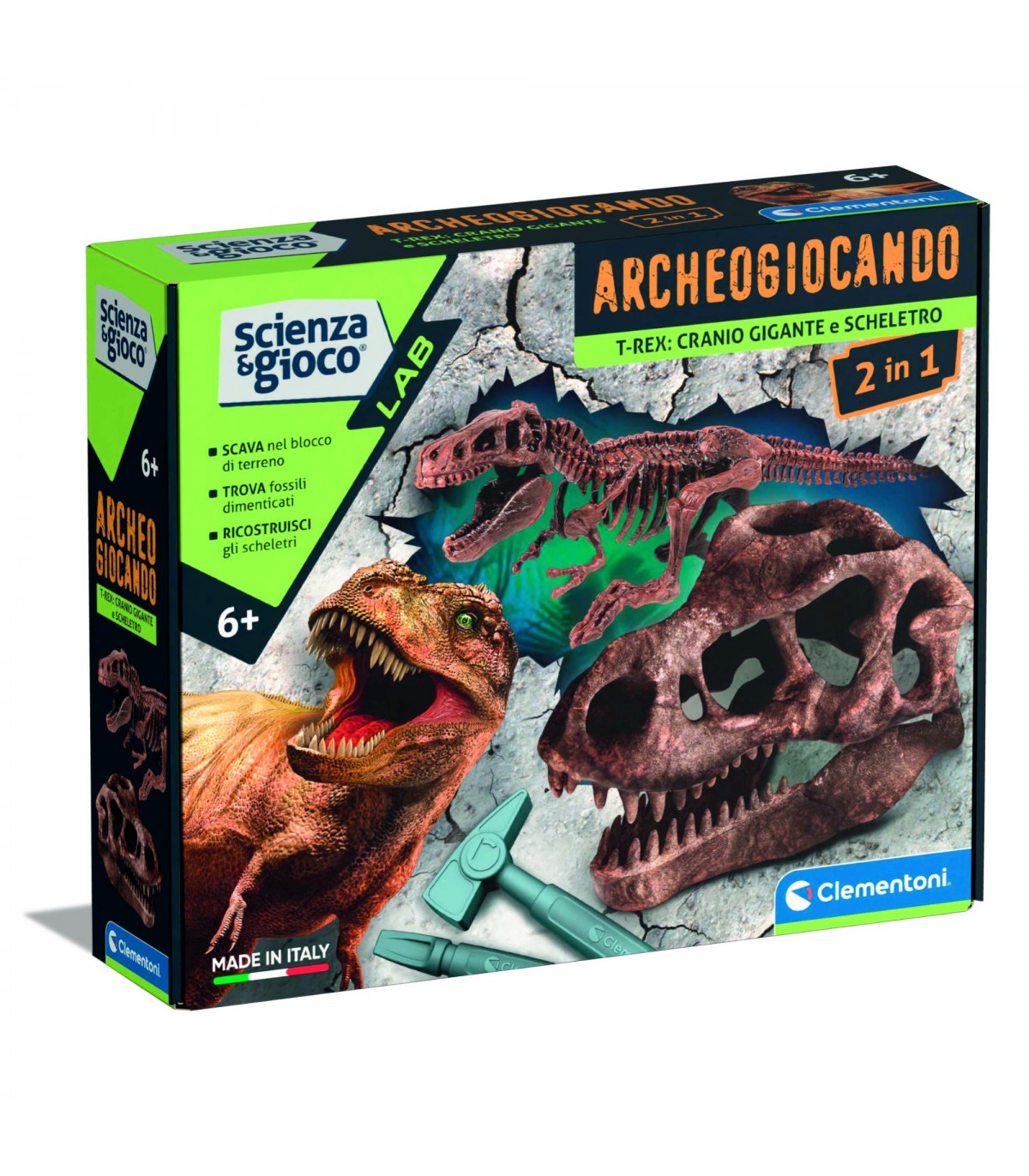 Un gioco scientifico alla scoperta di uno dei dinosauri più temuti del Giurassico! Il kit contiene un mattone in gesso da scavare con martello e scalpello per recuperare tutte le parti del teschio del grande T-rex. Il bambino potrà divertirsi a ricostruire il teschio e lo scheletro proprio come un vero paleontologo! Il kit contiene anche uno scheletro gigante da assemblare Ideato e progettato in Italia.