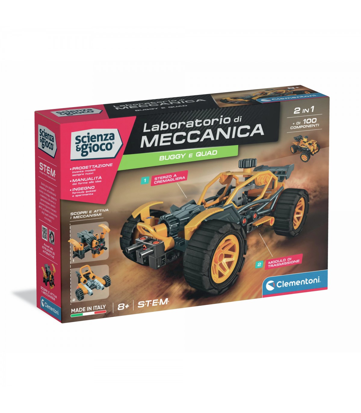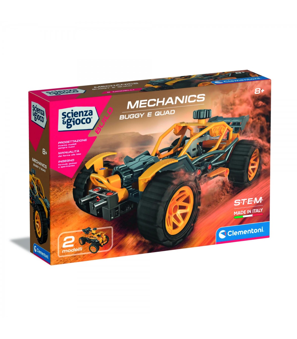 Un kit scientifico made in Italy con cui divertirsi ad assemblare una buggy o un quad. Il kit contiene oltre 100 pezzi per costruire 2 diversi modelli dotati di meccanismi a trasmissione. Il manuale illustrato permette di assemblare la buggy passo dopo passo. Tanti pezzi speciali come il modulo di trasmissione, gli ingranaggi e altri ancora permettono di aumentare la giocabilità dei veicoli. L'app Scienza gioco Build integra l'esperienza di gioco fornendo un supporto al montaggio di tutti i modelli grazie alle animazioni 3D interattive.