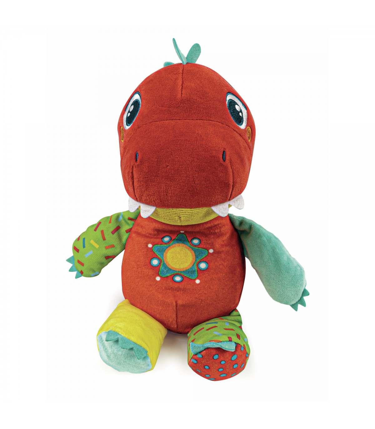 Un dinosauro tenero e simpatico, per divertirsi e imparare! Il tasto centrale attiva la riproduzione di canzoncine e filastrocche che stimolano la lallazione, introducono alle lettere e alle prime parole, ai primi numeri e ai colori. I diversi tessuti e gli elementi fruscianti stimolano lo sviluppo multisensoriale del bambino. Un personaggio dolce ed empatico, da coccolare e portare sempre con sé. La riconoscibilità del dinosauro e le sue tenere fattezze creano un'immediato legame con i bambini favorendo lo sviluppo della loro affettività.