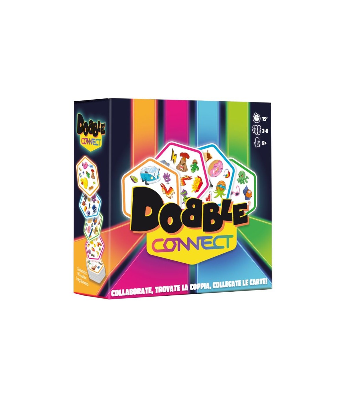 Dobble Connect consiste in 90 carte, 10 simboli per ognuna, e più di 91 simboli in totale.C&rsquoè sempre 1 solo simbolo in comune tra 2 carte qualsiasi. State pronti a trovarlo! Giocate in squadra o come singoli giocatori, e cercate di essere i primi a formare una linea di 4 carte del vostro colore!Cercate di essere la squadra più veloce a collegare 4 carte del vostro colore in fila!Nominate l&rsquounico simbolo in comune tra le carte della vostra mano e quelle già collocate sul tavolo per allineare nuove carte.Dovete essere la squadra più veloce a collegare 4 carte del vostro colore in fila per vincere un round!Aggiudicatevi più round per ottenere la vittoria! Tutti giocano simultaneamente, quindi bloccate le altre squadre con le vostre carte prima che lo facciano loro!Divertente, veloce e frenetico: Dobble Connect è IL gioco di velocità per eccellenza, il divertimento è assicurato!Contenuto: 90 carte, 1 regolamento.