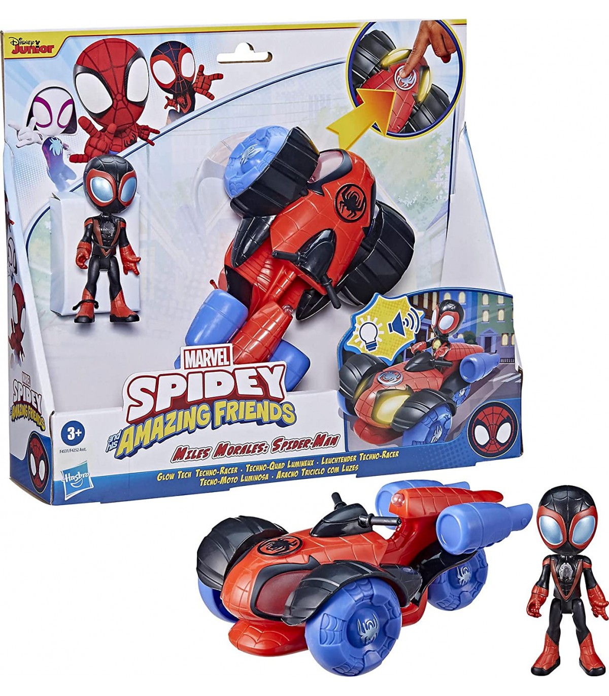 È il momento di Spidey! Bambini e bambine in età prescolare adoreranno il veicolo Techno-Racer di Spidey e i suoi fantastici amici con tecnologia Glow Tech che, grazie a un semplice pulsante, si illumina e riproduce alcuni effetti sonori ispirati alla serie animata! Questo divertentissimo veicolo che si illumina contiene anche l'action figure snodata di Miles Morales: Spider-Man. Quando l'action figure viene posizionata nell'abitacolo, anch'essa si illumina insieme all'auto! Delle dimensioni adatte per le manine dei più piccoli, questo giocattolo di Spidey e i suoi fantastici amici è un divertente regalo per appassionati e appassionate della serie animata Marvel per età prescolare dai 3 anni in su. Copyright MARVEL. Tutti i marchi commerciali e i marchi commerciali registrati appartengono ai rispettivi titolari. Hasbro e tutti i termini correlati sono marchi commerciali di Hasbro.