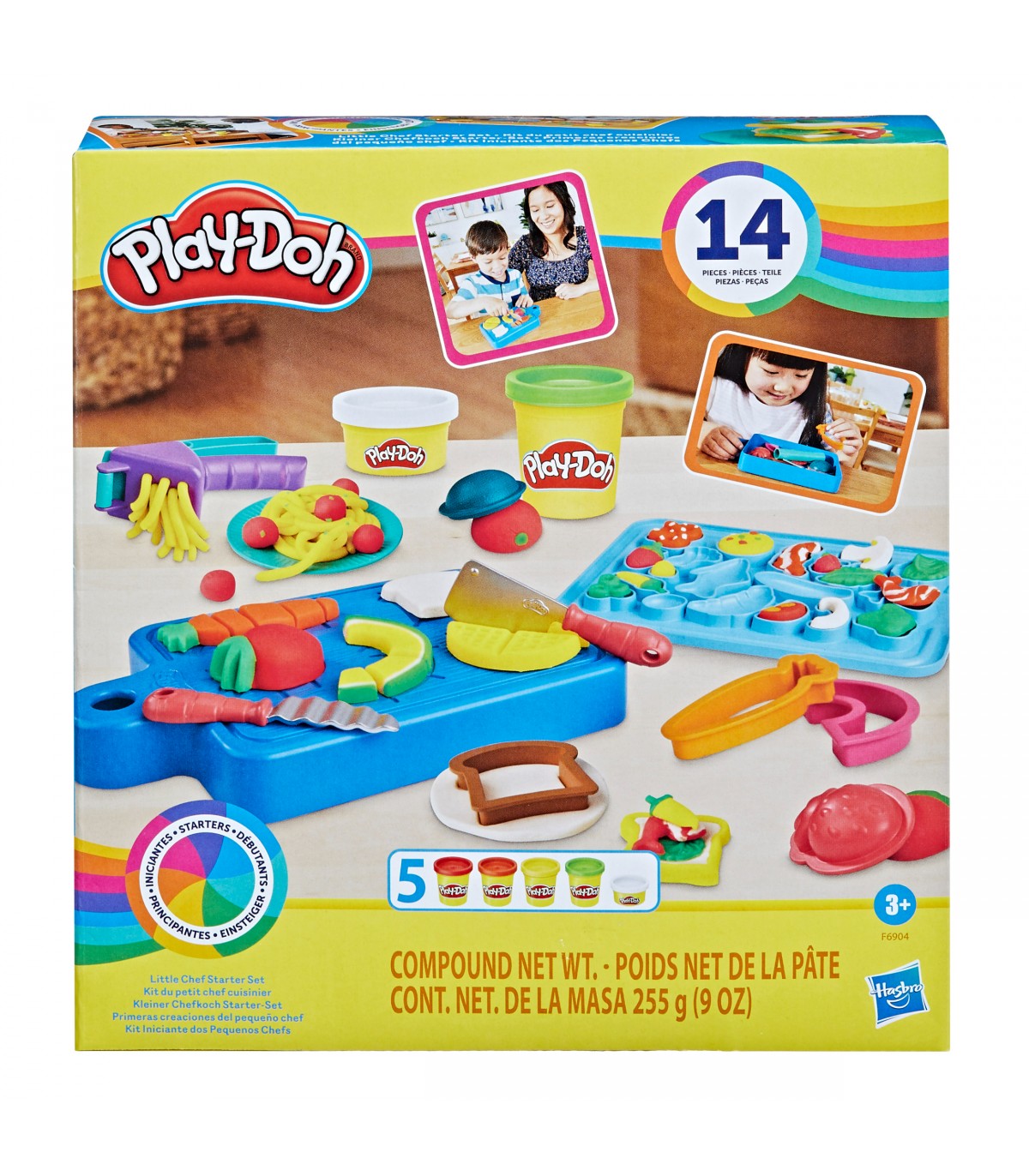 Con Il Mio Primo Set da Chef, i bambini dai 3 anni in su ameranno preparare squisiti piatti di Play-Doh con l'aiuto di questo tagliere! Questo set è più semplice da usare per i bambini, proprio un primo set prima di diventare esperti cuochi di Play-Doh. Un divertente tagliere con delle line per guidare i piccolo chef nel tagliare e affettare le loro creazioni. Con un tagliere, 12 accessori, e 5 vasetti di Play-Doh, i piccoli chef non avranno limite nel creare le loro delizie culinarie! Infine, quando hanno finito di giocare, potranno riponere tutti gli accessori e/o creazioni all'interno del tagliere!