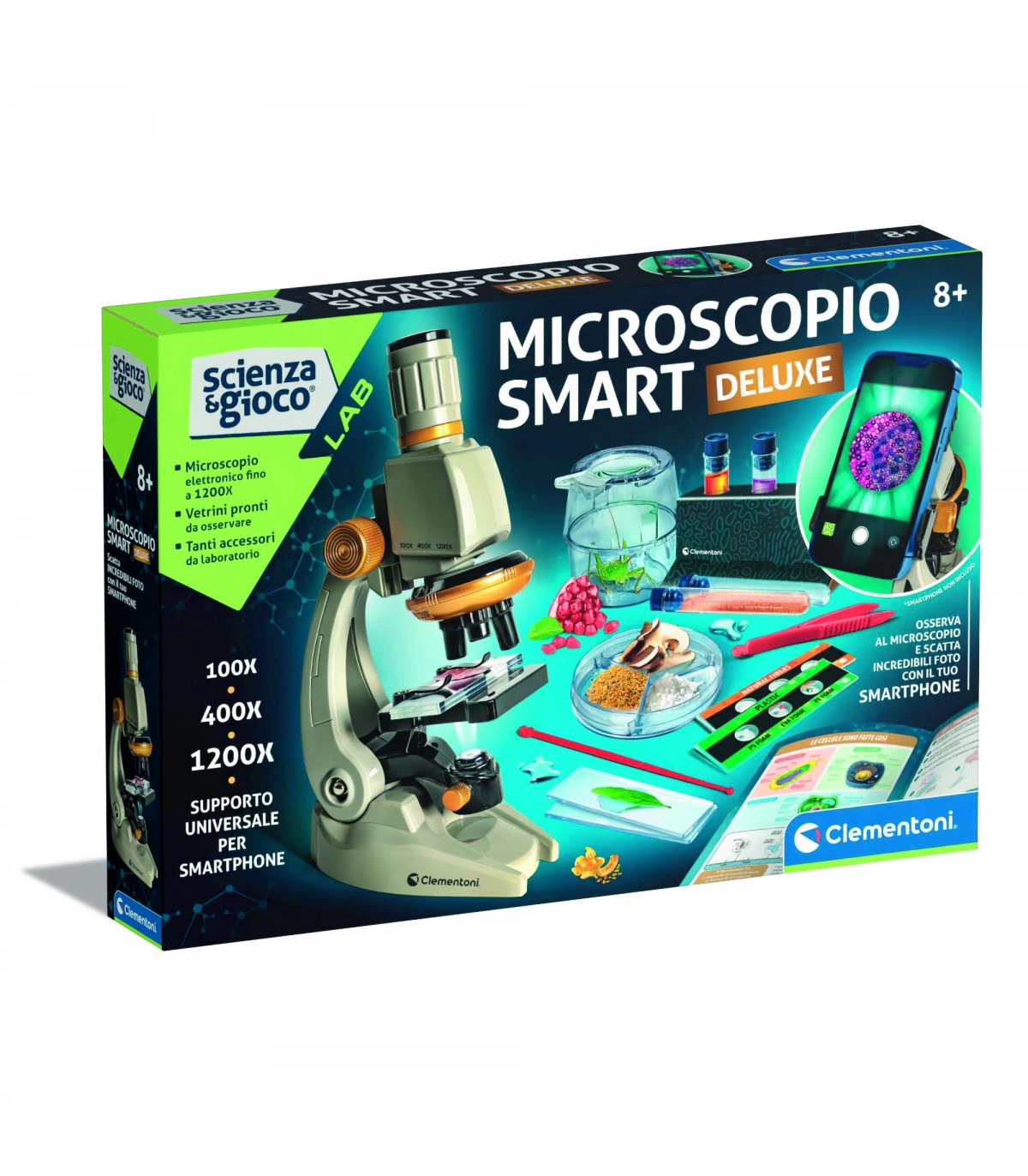Entra in un universo di scoperte con il Microscopio Smart De Luxe, il compagno ideale per giovani scienziati e curiosi di ogni età. Questo microscopio professionale non è solo uno strumento, ma una vera e propria stazione di ricerca che offre un'ampia gamma di attrezzature per realizzare esperimenti straordinari. Grazie ai vetrini pronti all'uso, potrai iniziare a esplorare sin da subito, mentre il supporto per smartphone ti consente di immortalare e condividere le tue osservazioni più sorprendenti. Immergiti in un'avventura scientifica che stimola la curiosità e la creatività!