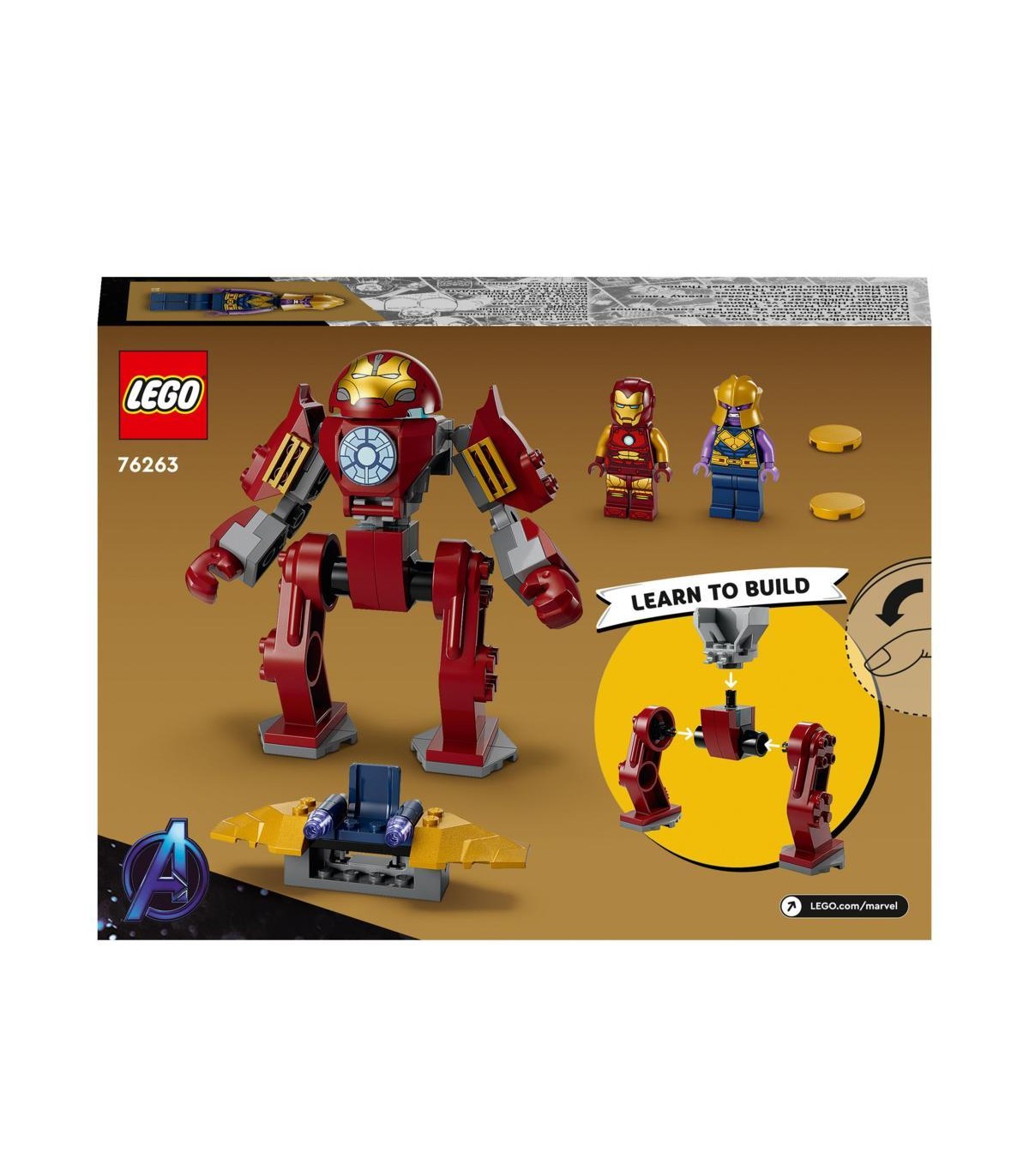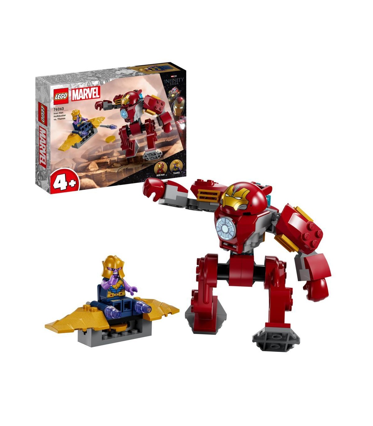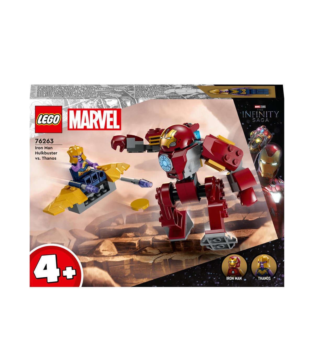 Il set di giochi LEGO Marvel Iron Man Hulkbuster vs. Thanos (76263), per bambini e bambine da 4 anni in su, mette nelle mani dei giovani supereroi tutto il divertimento e la tecnologia di un gioco semplice da costruire e ricco d'azione.I set LEGO 4+ sono il miglior modo per i più piccoli per iniziare a costruire! Basato su Avengers: Infinity War di Marvel Studios, questo set permette di costruire l'action figure mech del supereroe Iron Man e l'aereo giocattolo del supercattivo Thanos. Il mech Hulkbuster è completamente snodabile e include un posto a sedere per la minifigure del personaggio di Iron Man, mentre il velivolo di Thanos è dotato di lancia-dischi e di sedile per la minifigure. All'interno della scatola, ogni sacchetto di mattoncini contiene un modello completo e un personaggio, che i bambini possono assemblare per giocare subito. Una colorata storia illustrata funge da guida per la costruzione e per il gioco, mentre 2 Starter Brick con le gambe del mech semplificano la costruzione.Un
