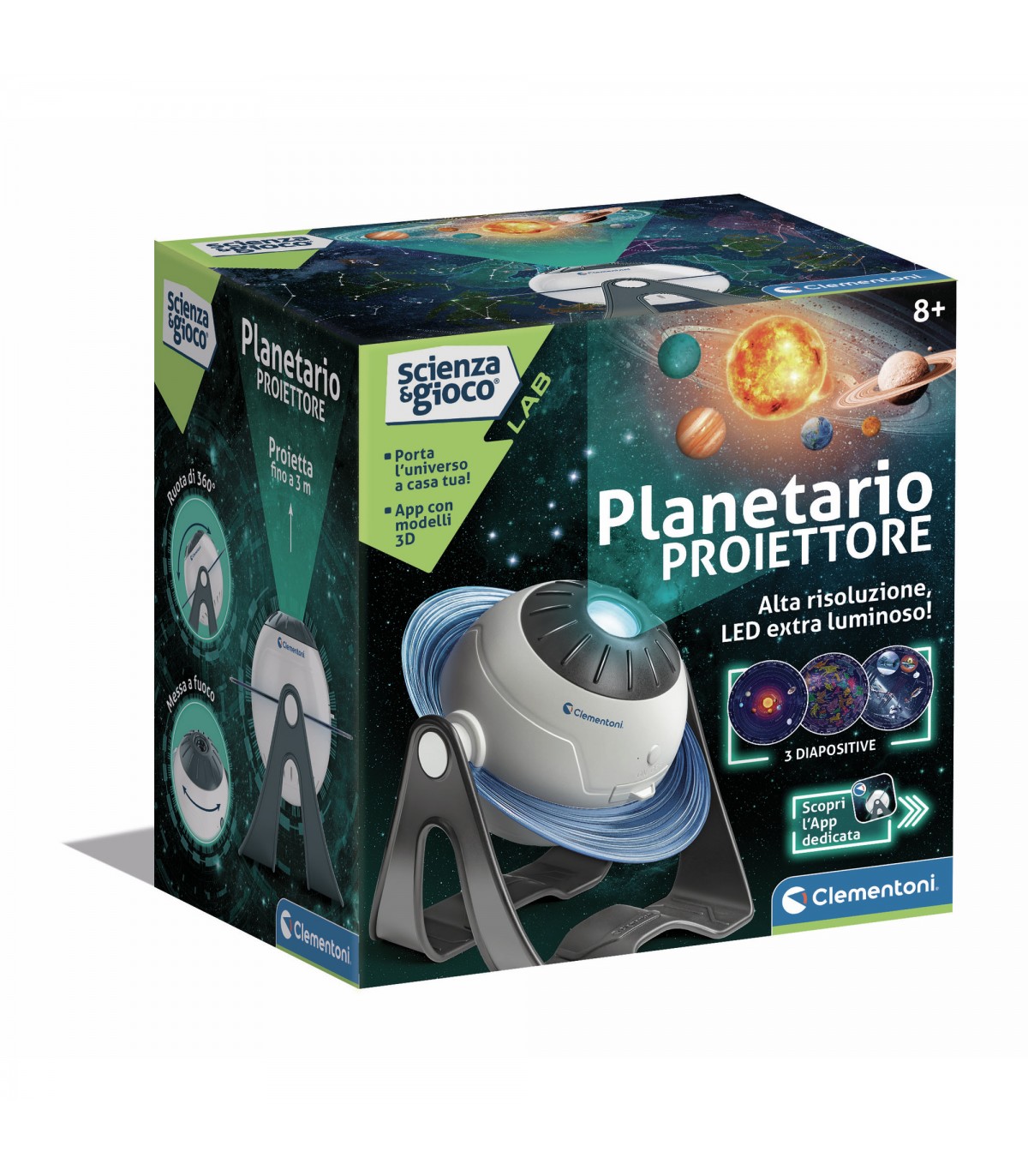 Un Planetario proiettore per osservare e ammirare le stelle, le costellazioni, i pianeti del sistema solare e tanto altro proprio sulle pareti della tua camera! Scegli tu cosa proiettare e cambia le diapositive del Planetario! App dedicata con tantissime funzionalità: informazioni e curiosità sul sistema solare e sulle costellazioni, realtà aumentata per fantasistiche animazioni 3D e quiz interattivi e divertenti! Pensato per apprendere la scienza dell'astronomia in maniera innovativa e divertente! Ideato e progettato in Italia.