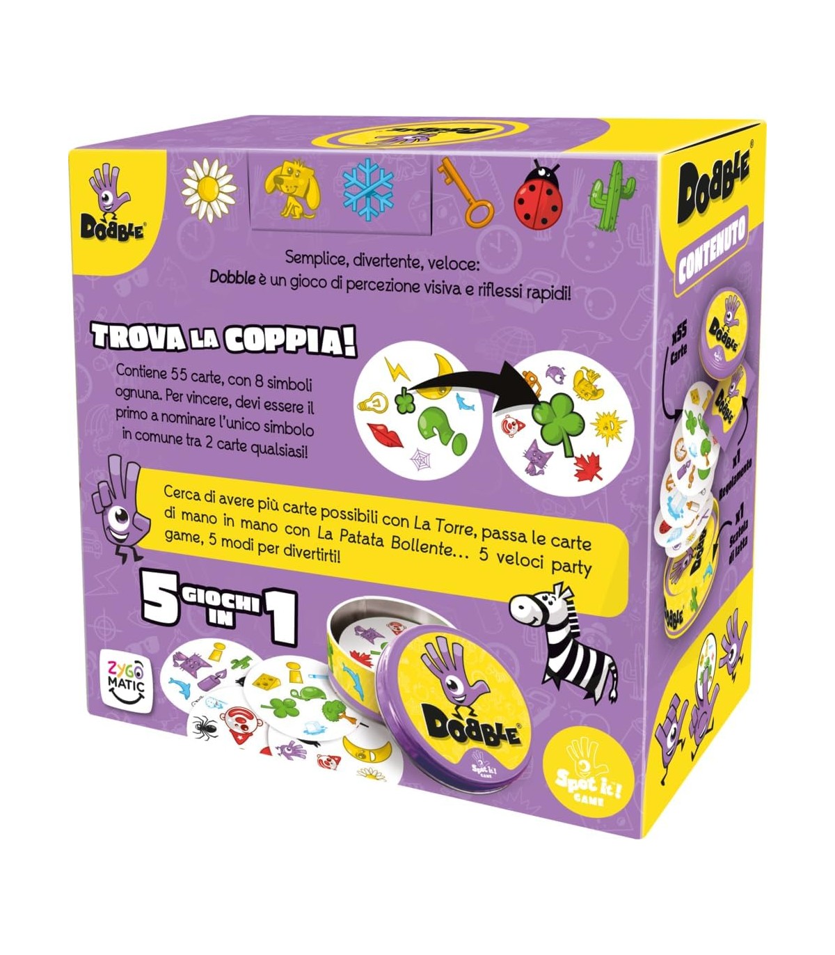 La nuova versione di Dobble eco-friendly!Dobble è più di 50 simboli, 55 carte, 8 simboli per carta e sempre un solo simbolo in comune tra due carte qualsiasi. Sta a voi trovare quale.Dobble comprende 5 mini-giochi basati sulla rapidità (La torre infernale, Il pozzo, La patata bollente, Prendile tutte! e Il regalo avvelenato) in cui tutti i giocatori agiscono allo stesso tempo. Potete giocare i mini-giochi in un ordine specifico, casualmente, oppure potete continuare a giocare sempre allo stesso più volte. L&rsquounica cosa che conta è divertirsi!Indipendentemente dal tipo di gioco, dovete sempre essere i più rapidi a trovare il simbolo identico tra due carte, nominarlo a voce alta e poi prendere la carta, piazzarla o scartarla a seconda delle regole del mini-gioco a cui state giocando.
