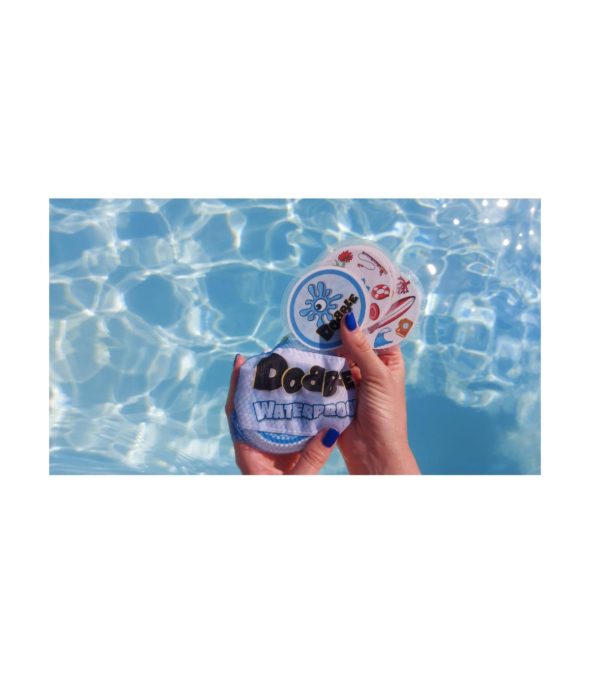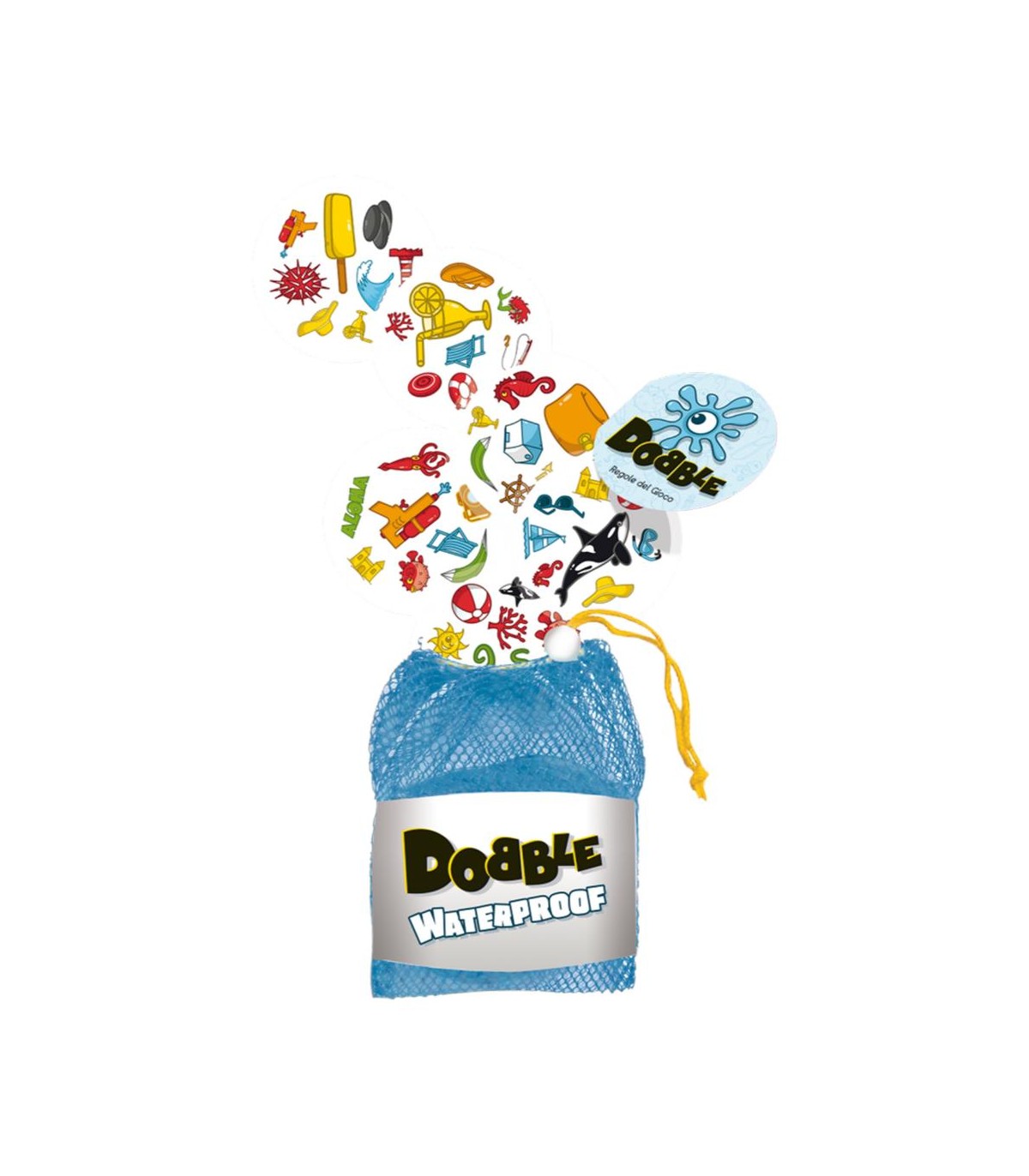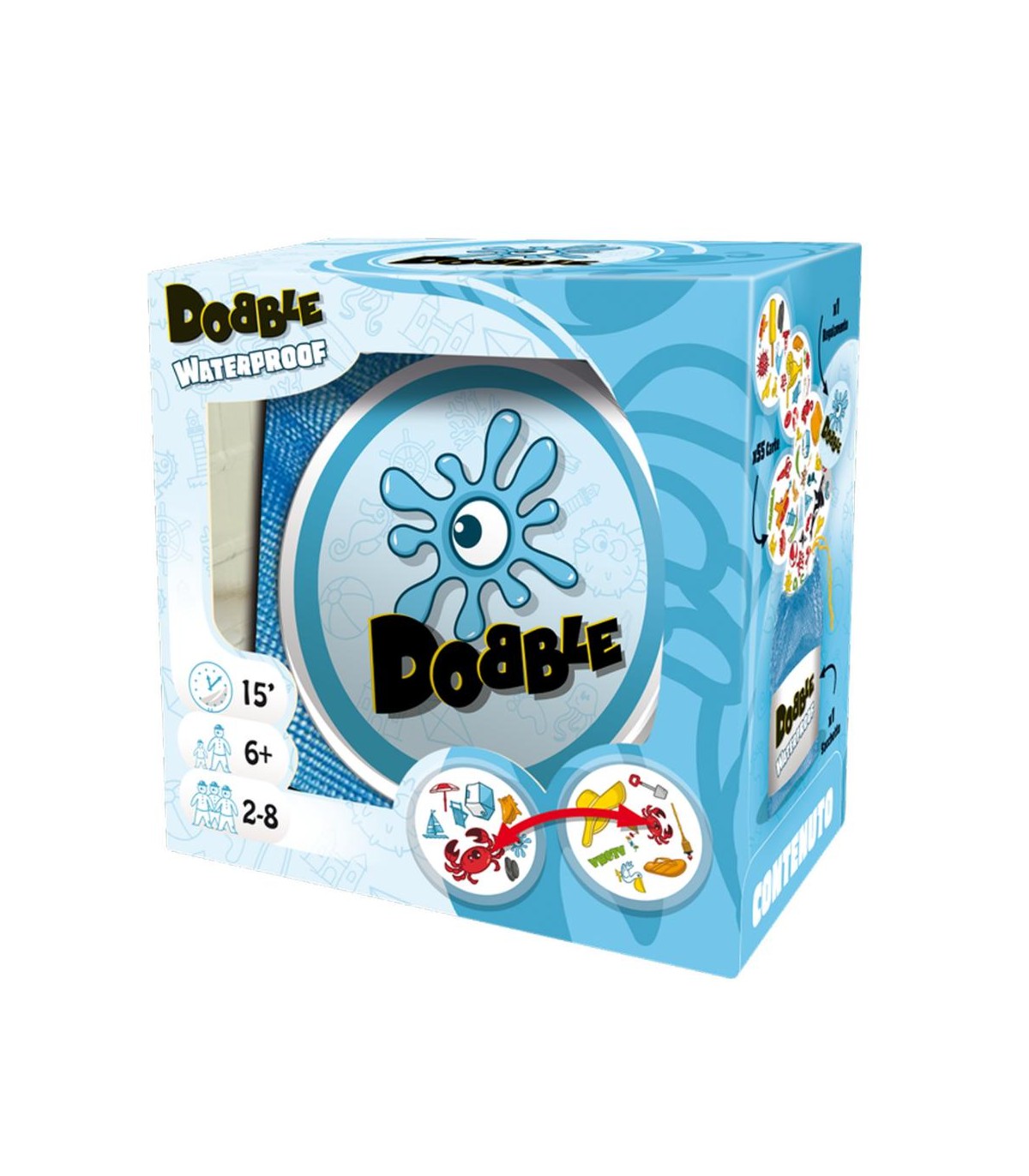 La versione IMPERMEABILE di Dobble!55 carte, 8 simboli per ognuna. e sempre 1 solo simbolo in comune tra 2 carte!Riuscirete a trovarlo per primi?Che siate in spiaggia, in piscina o nella vostra vasca da bagno, dovrete essere i più rapidi per vincere!Con Dobble Waterproof puoi giocare ovunque! Questa versione a tema spiaggia fiinclude carte plastificate resistenti all&rsquoacqua e alla sabbia. Portalo sempre con te grazie al pratico sacchetto in rete!Contenuto: 55 carte, 1 regolamento.