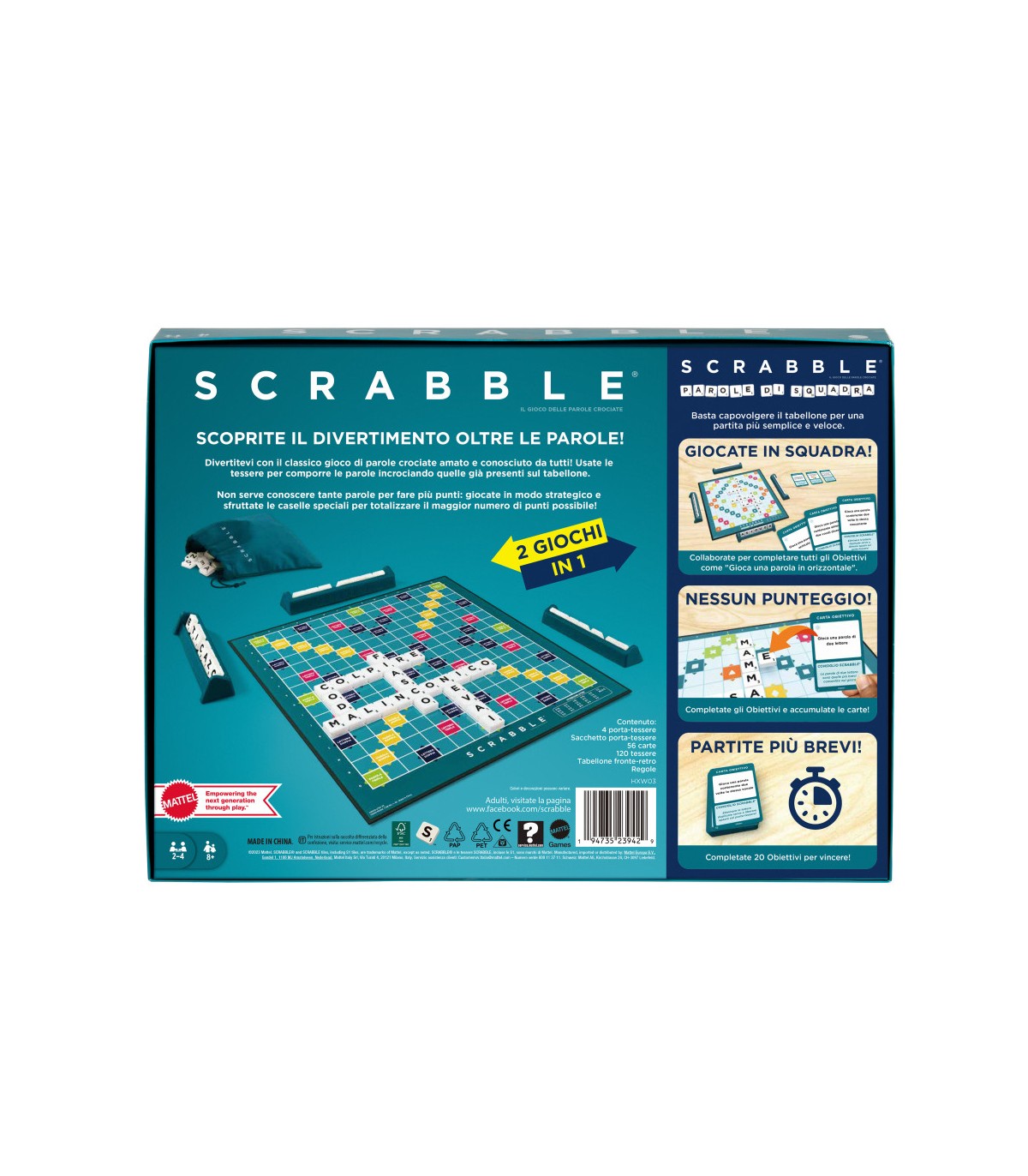 Scopri il divertimento oltre le parole con il gioco da tavolo Scrabble, ora con due giochi in uno! I giocatori possono divertirsi con il classico gioco delle parole crociate Scrabble che conoscono e amano creando parole e cercando di ottenere punteggi di Lettera Doppia e Parola Tripla, oppure possono girare il tabellone e provare Scrabble Parole di Squadra, un gioco semplice e veloce in cui i giocatori cooperano per completare le sfide delle parole. Questi due giochi sono DIVERTENTI sia per i giocatori di vecchia data che per quelli nuovi!