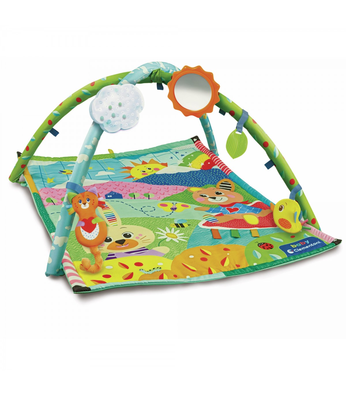 Una colorata Palestrina con tante attività che il bambino può svolgere con i genitori o in autonomia. Con morbidi pendenti in plastica e stoffa sviluppare le capacità manuali, visive ed uditive del bambino. I soffici personaggi gatto ed uccellino stimolano la manualità del bambino. Il sole è uno specchietto per stimolare il riso ed il riconoscimento di se stessi. La nuvola è un sonaglino che simula il rumore della pioggia. I personaggi illustrati nel tappeto richiamano gli accessori e la loro funzione, guidando i genitori nel gioco con il bambino. Tappeto e peluche lavabili a mano.