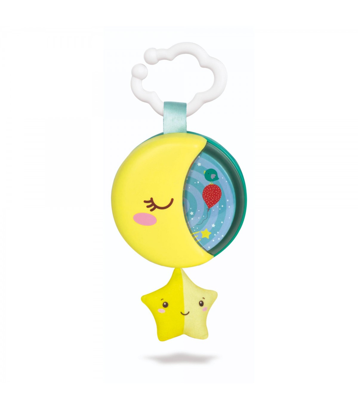 Il tenero carillon a forma di luna e la morbida stellina accompagnano il bambino nel momento della nanna per fare tanti sogni d'oro in un mondo di dolcezza. Tirando la maniglia a forma di stellina il carillon suona una dolce melodia di Mozart e la lenta rotazione del disco illustrato favorisce il rilassamento del piccolo. Grazie all'anello a forma di nuvoletta si può appendere facilmente il carillon e portarlo sempre con sè. Adatto per far addormentare il bambino. Un prodotto classico, per i primi mesi di sviluppo del bambino.