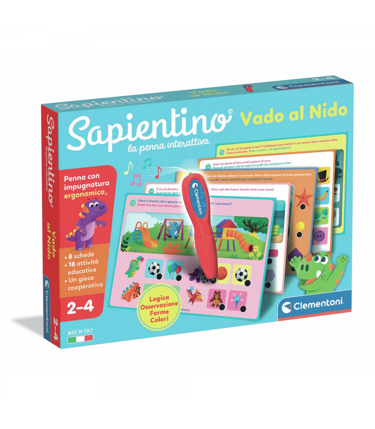 8 schede educative per giocare con la simpatica penna interattiva per risolvere i quiz. 16 differenti attività di gioco a quiz e un gioco di aguzza la vista incluso nella confezione. Compendio di quiz e attività educative per i bambini al primo ingresso nella scuola dell'infanzia. La penna interattiva riconosce la risposta esatta ed emette un suono gioioso Made in Italy