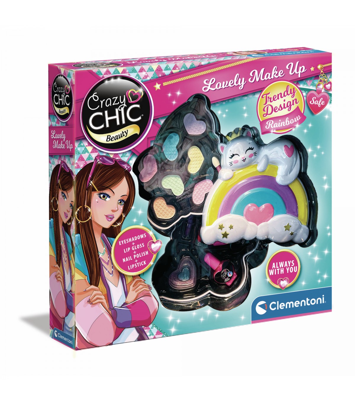 Una trousse a forma di arcobaleno con 2 vassoi ricchi di ombretti, rossetti e smalti anche in aggiunta per avere sempre una ricarica da portare con sé. Un dolce gattino, che riposa sull'arcobaleno, sfoggia la coroncina dorata che caratterizza i trucchi della linea Crazy Chic, tutti da collezionare. La trousse ha due vassoi ricchi di ombretti, rossetti e smalti per divertirsi a creare, ogni volta, un trucco nuovo e diverso. I trucchi della trousse sono testati e sicuri per bambini così da farli giocare in completa sicurezza. Inoltre sono facilmente rimovibili con acqua. Età consigliata: + 6 anni