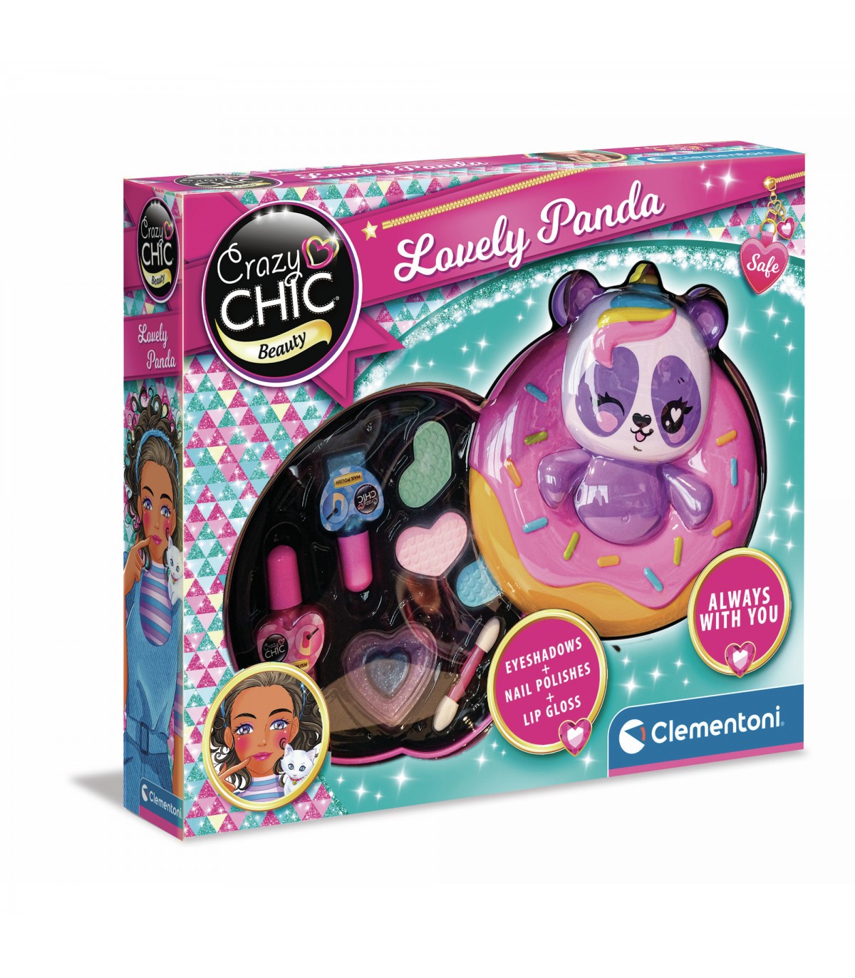 Crazy Chic Trousse Panda offre un'esperienza di trucco sicura e divertente, grazie ai prodotti testati appositamente per i più piccoli. Ogni ombretto è dotato di un applicatore facile da usare, mentre il lipgloss e gli smalti garantiscono un tocco di colore e brillantezza. Questo set non è solo un modo per esprimere la propria creatività, ma anche per divertirsi in modo sicuro e responsabile. La linea Lovely, con il suo adorabile cucciolo e il corno multicolor, stimola l'immaginazione e incoraggia il gioco, rendendo il trucco un'attività ludica e gioiosa.
