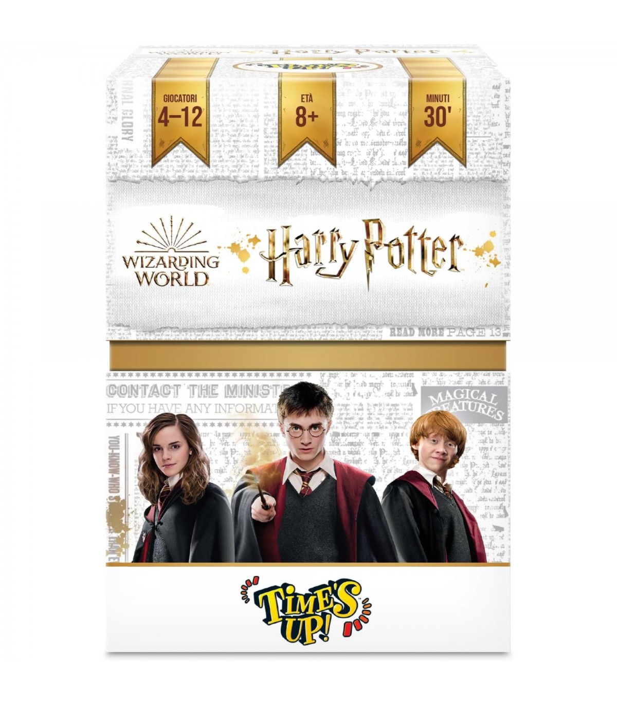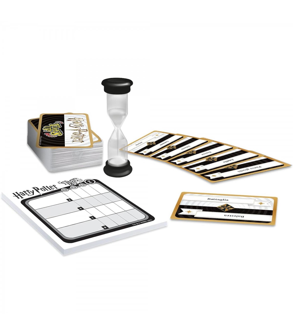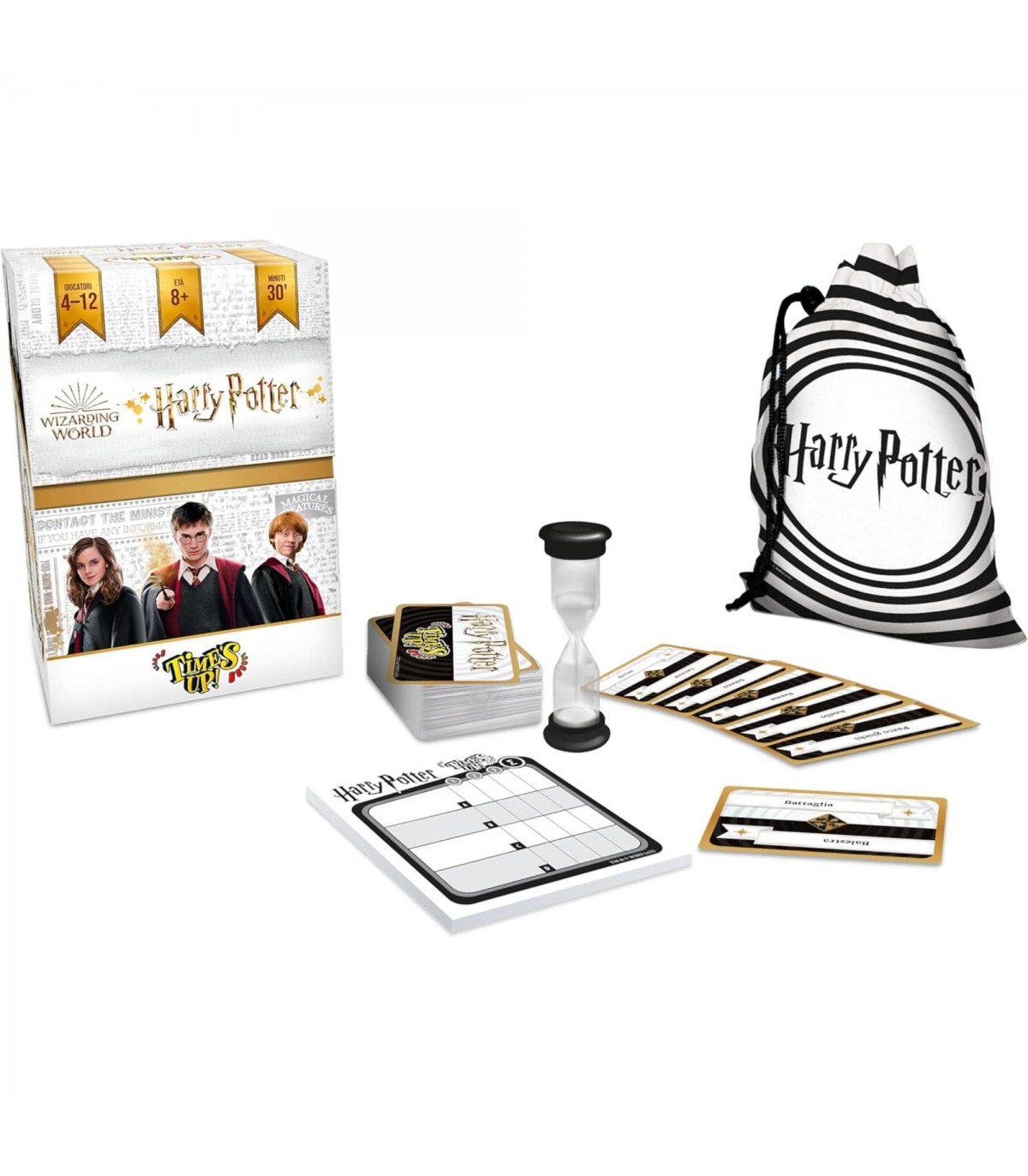 Una nuova versione di Time&rsquos Up a tema Harry Potter!Un divertentissimo party game per adulti e ragazzi!Quanto bene conoscete l'universo di Harry Potter?Credete di essere imbattibili super fan?Avete 40 secondi e 3 round per far indovinare il maggior numero di carte alla tua squadra!Nel primo round, descrivete le carte senza dire cosa vi è scrittonel secondo, fate indovinare con una sola parola le stesse cartenel terzo, mimatele ai vostri compagni di squadra!Contenuto: 1 clessidra, 220 carte, 1 regolamento, 1 sacchetto e 1 blocco segnapunti.