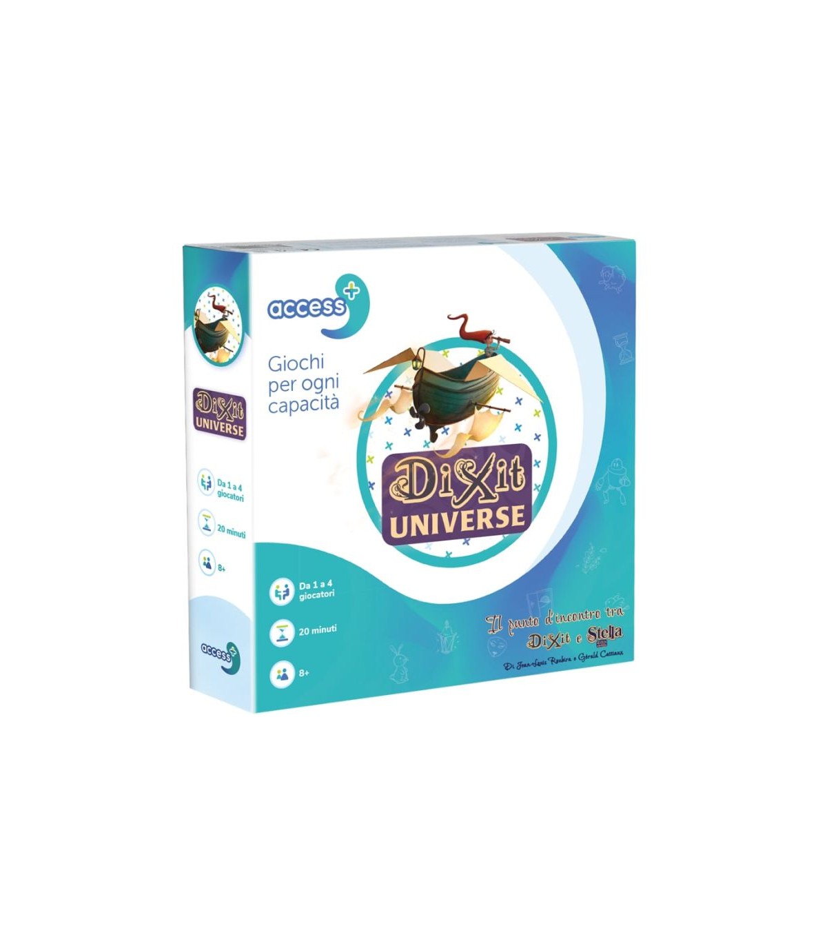 Scoprite la versione Access+ dei popolari giochi Asmodee, adattata per i giocatori affetti da disturbi cognitivi.Dixit Universe Access+ è un adattamento dei celebri giochi di carte Dixit e Stella &ndash Dixit Universe.Un modo divertente per lavorare sulle immagini mentali, sulla parola e sul discorso.Grazie ai materiali e alle regole adattate, tutti possono partecipare al divertimento. Usate le carte Voto per abbinare la parola indicata a tre carte Immagine che la illustrano al meglio. Scegliete il livello di difficoltà, le regole che preferite e poi il gioco è fatto!Testati sul campo e certificati da professionisti del settore medico e ricreativo, i giochi Access+ si concentrano sull&rsquoaccessibilità e sull&rsquoimmediatezza. Stimolano un&rsquoampia gamma di funzioni cognitive e promuovono l&rsquointerazione sociale in un contesto positivo e rassicurante.Contenuto: 18 carte Parola, 10 carte Parola e Simbolo, 35 carte Immagine Classiche, 35 carte Immagine Semplificate, 1 tabellone, 20 segnalini Vittoria, 4 set di carte Voto, 1 Regolamento.Imballo: 6 pz.