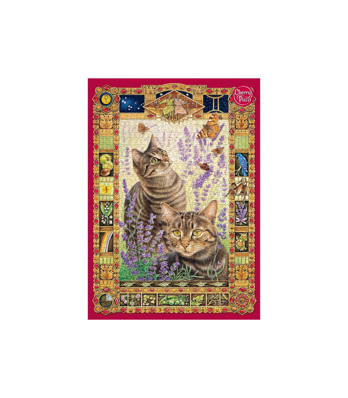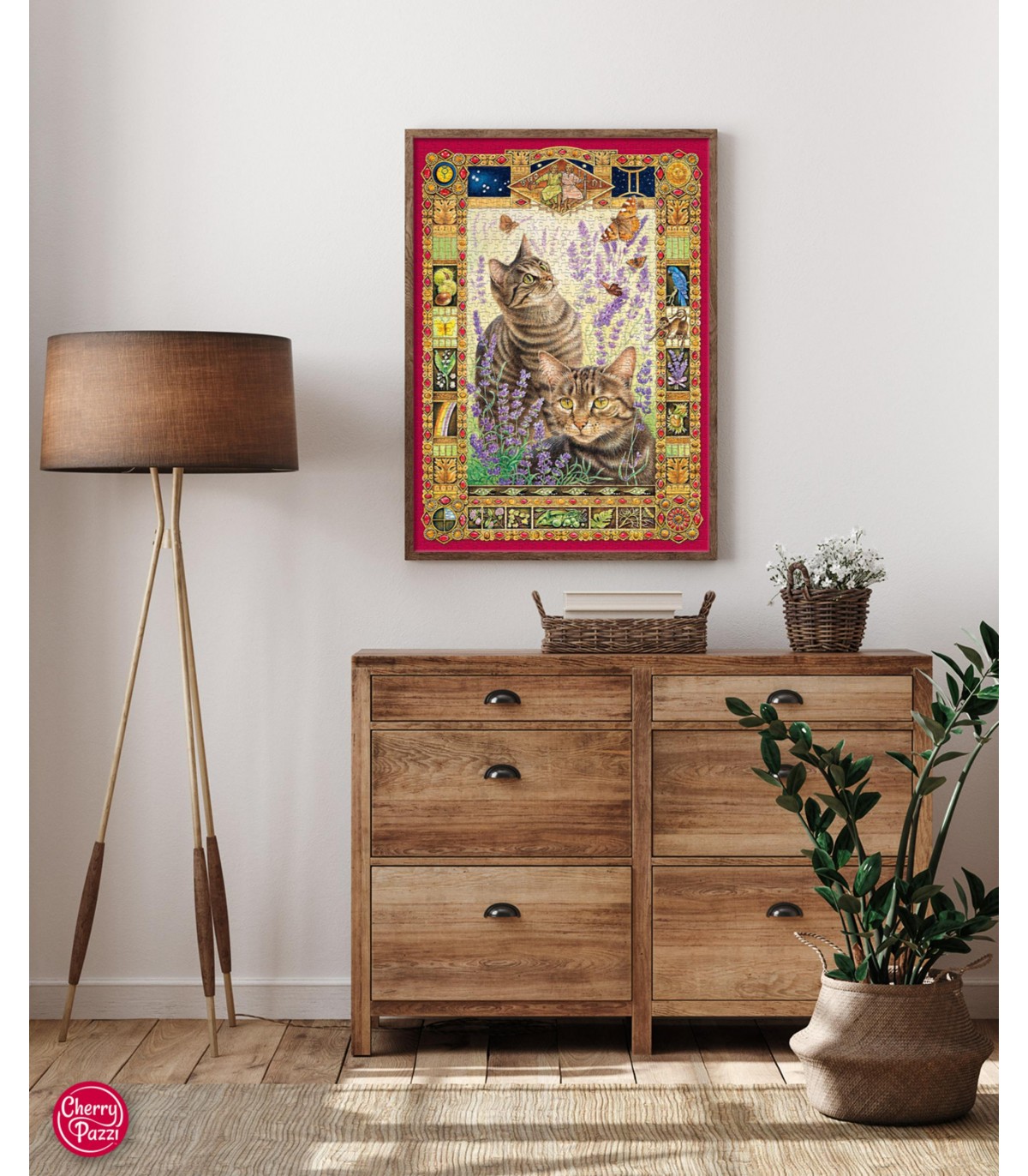Un ritratto unico e intricato di gatti su sfondi riccamente decorativi. I bellissimi motivi, la decorazione a mosaico e i colori sottili del pelo sono perfetti per gli amanti dei felini.