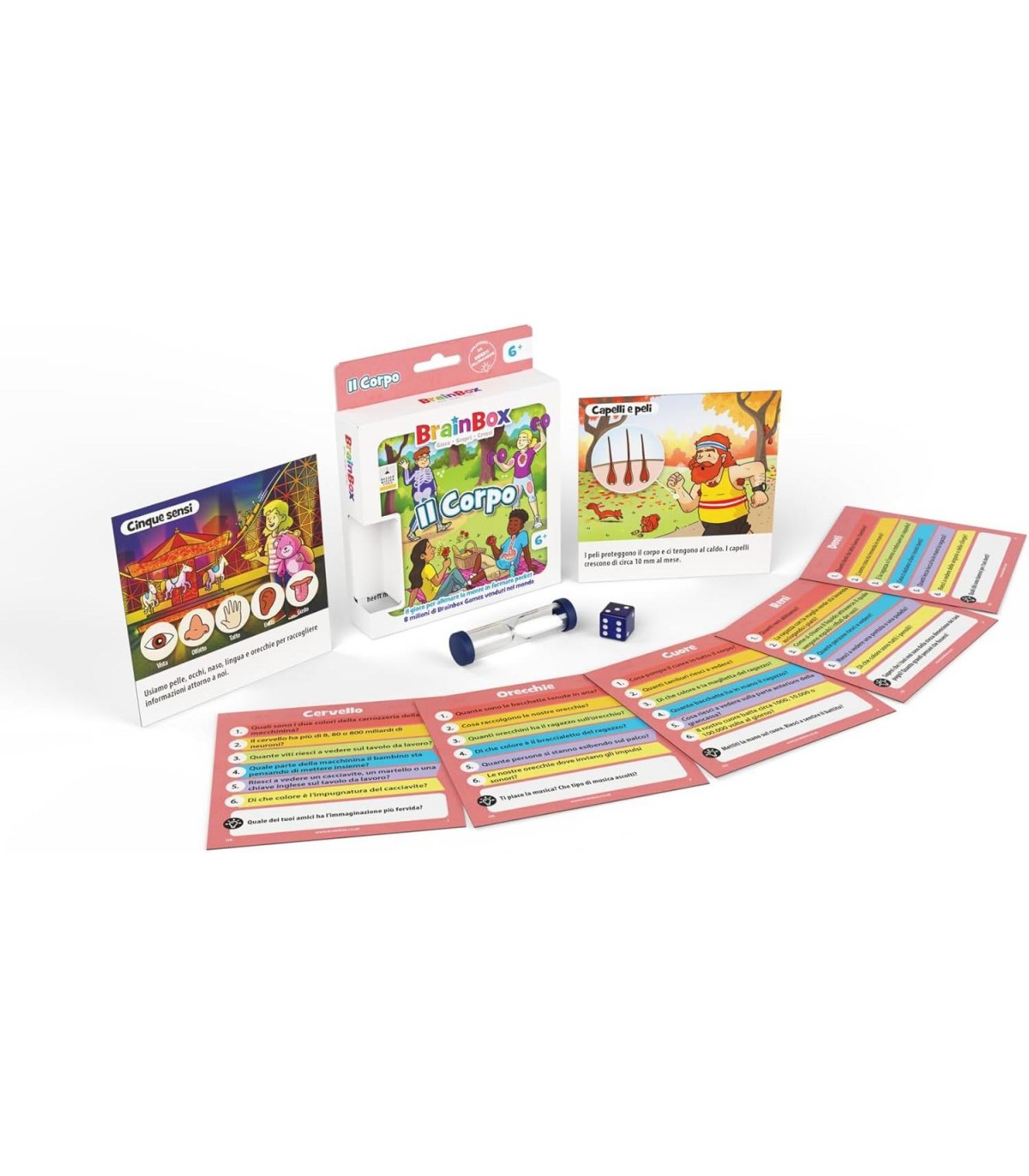 EDIZIONE POCKET.Allenate la vostra memoria e la vostra capacità di osservazione con la linea di giochi BrainBox!I giochi BrainBox stimolano menti più e meno giovani in un entusiasmante viaggio alla scoperta di nuovi mondi e migliorano la capacità di osservazione e la memoria.Osservate attentamente le carte, giratele e rispondete alle domande nel tempo della clessidra senza guardarle di nuovo.Questa edizione pocket contiene 150 domande e illustrazioni disegnate a mano che danno vita a ogni carta.Scoprite fatti curiosi e sorprendenti sul corpo umano, come ciò che rende il nostro cervello così straordinario e il motivo per cui si starnutisce!Con BrainBox Il Corpo giocherete e imparerete insieme.Contenuto: 25 carte, 1 clessidra da 10 secondi, 1 dado a 6 facce.