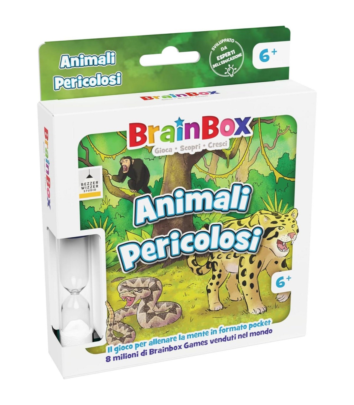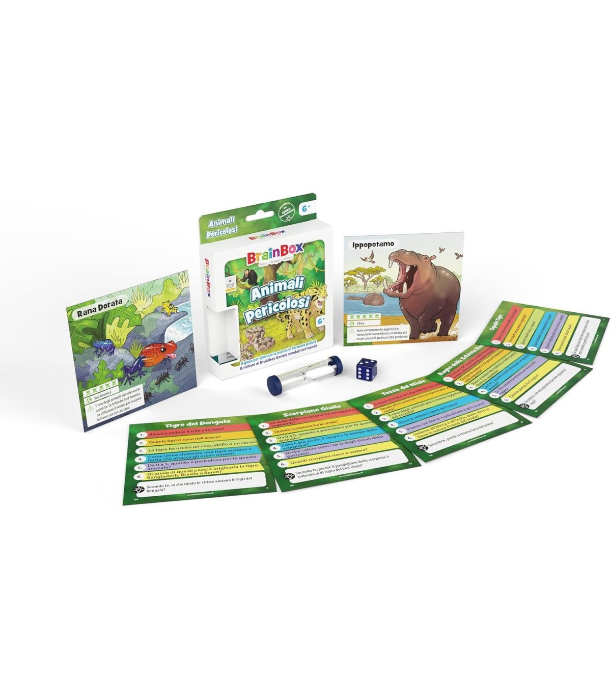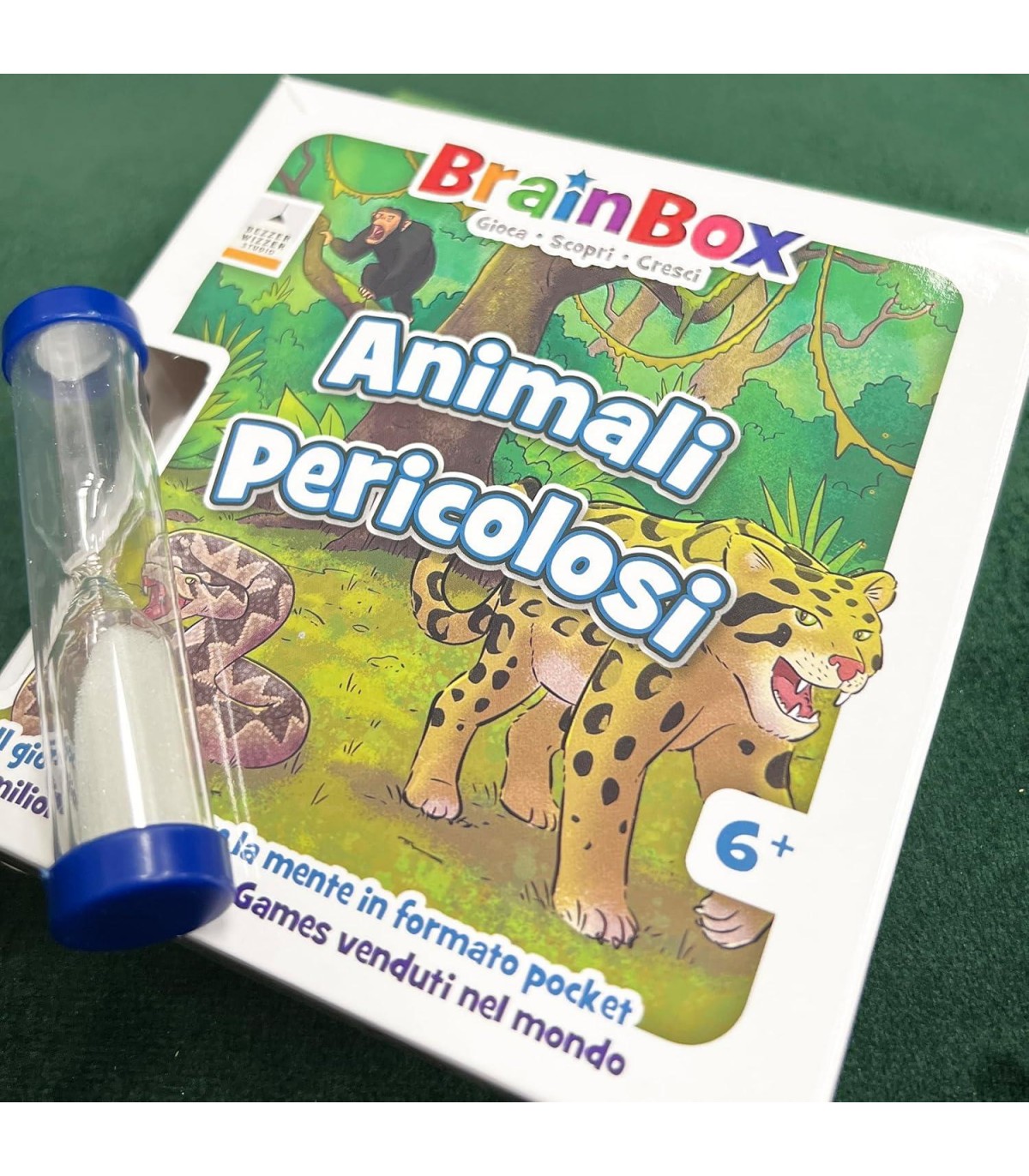 EDIZIONE POCKET.Allenate la vostra memoria e la vostra capacità di osservazione con la linea di giochi BrainBox!I giochi BrainBox stimolano menti più e meno giovani in un entusiasmante viaggio alla scoperta di nuovi mondi e migliorano la capacità di osservazione e la memoria.Osservate attentamente le carte, giratele e rispondete alle domande nel tempo della clessidra senza guardarle di nuovo.Questa edizione pocket contiene 150 domande e illustrazioni disegnate a mano che danno vita a ognicarta. Scoprite alcuni degli animali più pericolosi del mondo e se fanno davvero paura!Con BrainBox Animali Pericolosi giocherete e imparerete insieme.Contenuto: 25 carte, 1 clessidra da 10 secondi, 1 dado a 6 facce.