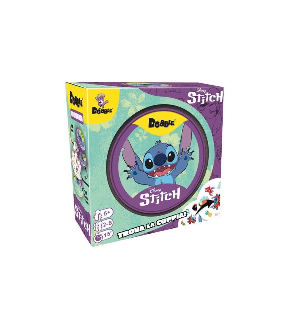 La nuovissima versione di Dobble a tema Stitch eco-friendly!Dobble è più di 50 simboli, 55 carte, 8 simboli per carta e sempre un solo simbolo in comune tra due carte qualsiasi. Sta a voi trovare quale.Dobble comprende 5 mini-giochi basati sulla rapidità (La torre infernale, Il pozzo, La patata bollente, Prendile tutte! e Il regalo avvelenato) in cui tutti i giocatori agiscono allo stesso tempo. Potete giocare i mini-giochi in un ordine specifico, casualmente, oppure potete continuare a giocare sempre allo stesso più volte. L&rsquounica cosa che conta è divertirsi!Indipendentemente dal tipo di gioco, dovete sempre essere i più rapidi a trovare il simbolo identico tra due carte, nominarlo a voce alta e poi prendere la carta, piazzarla o scartarla a seconda delle regole del mini-gioco a cui state giocando.