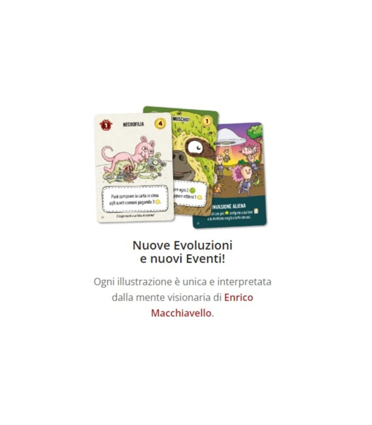 Evolversi Male non è solo un gioco, ma una vera e propria celebrazione dell'immaginazione e della connessione tra amici. Con oltre 100 carte originali illustrate dalla mente brillante di Enrico Macchiavello, ogni carta racconta una storia, un universo di possibilità che attende solo di essere esplorato. Le nuove evoluzioni introdotte con l'espansione Bradipo e Zanzara offrono infinite opportunità di strategia e creatività, sfidando i giocatori a pensare fuori dagli schemi. Mentre ti immergi in questo mondo fantastico, scoprirai che l’allegria e la competizione si fondono in un'esperienza ludica che rafforza i legami e crea ricordi indelebili. Non perdere l'occasione di arricchire le tue serate con questo gioco stimolante e divertente.