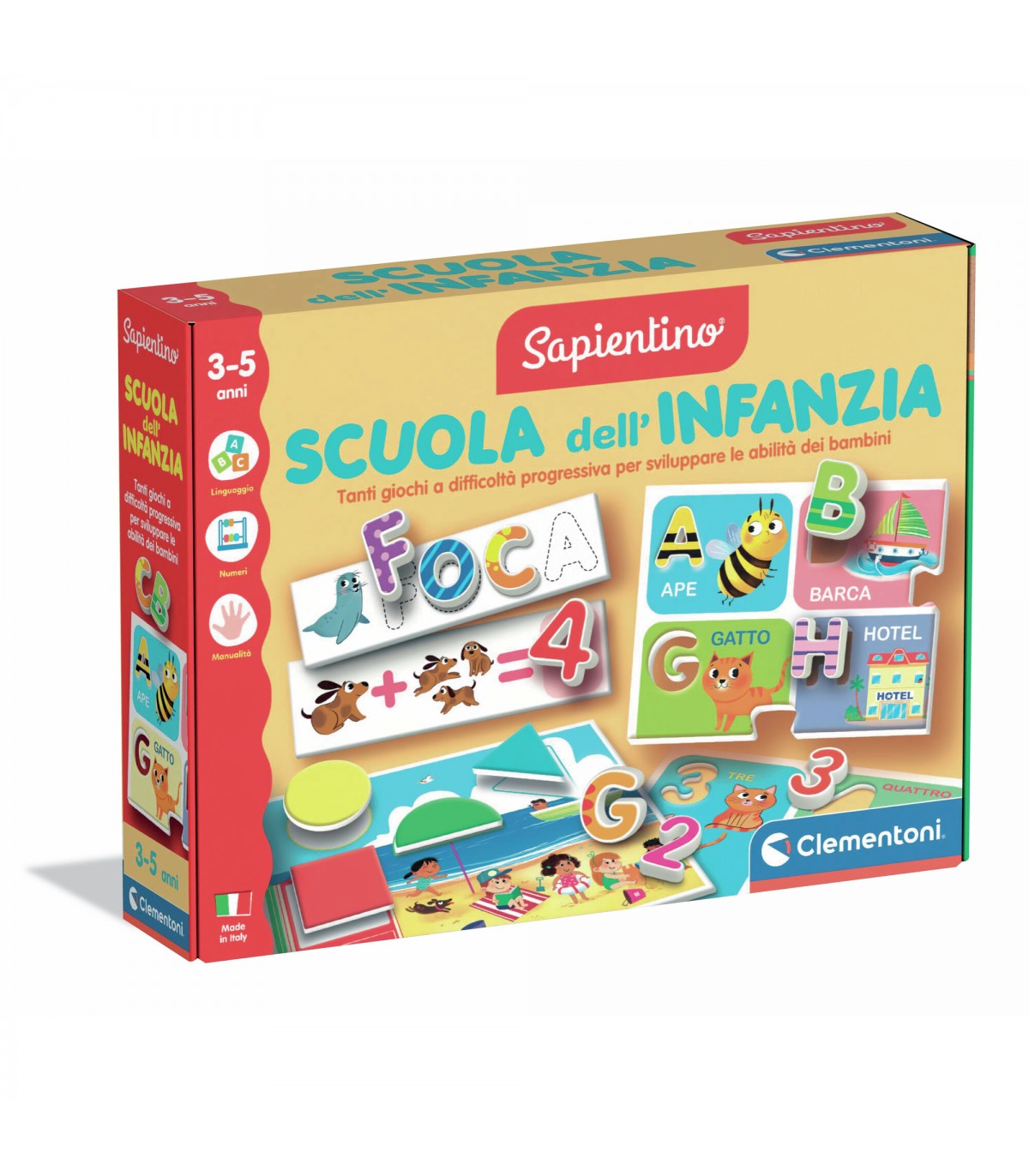 Scopri il fantastico mondo del Sapientino - Scuola dell'Infanzia, il kit perfetto per stimolare la curiosità dei più piccoli attraverso il gioco e l'apprendimento. Questo set completo offre un'esperienza educativa unica, con lettere e numeri in plastica colorata, un alfabetiere e un numeriere puzzle che rendono l'apprendimento divertente e coinvolgente. Le schede illustrate da completare con le formine in cartone e le carte interattive invitano i bambini a muoversi e a esprimersi, mentre contano e mimano le lettere. Con 10 giochi educativi progettati per la fascia prescolare, il Sapientino promuove l'acquisizione di concetti fondamentali in modo ludico e creativo. Perfetto per bambini dai 3 anni in su, questo kit non è solo un gioco, ma un viaggio emozionante verso la scoperta e la cres