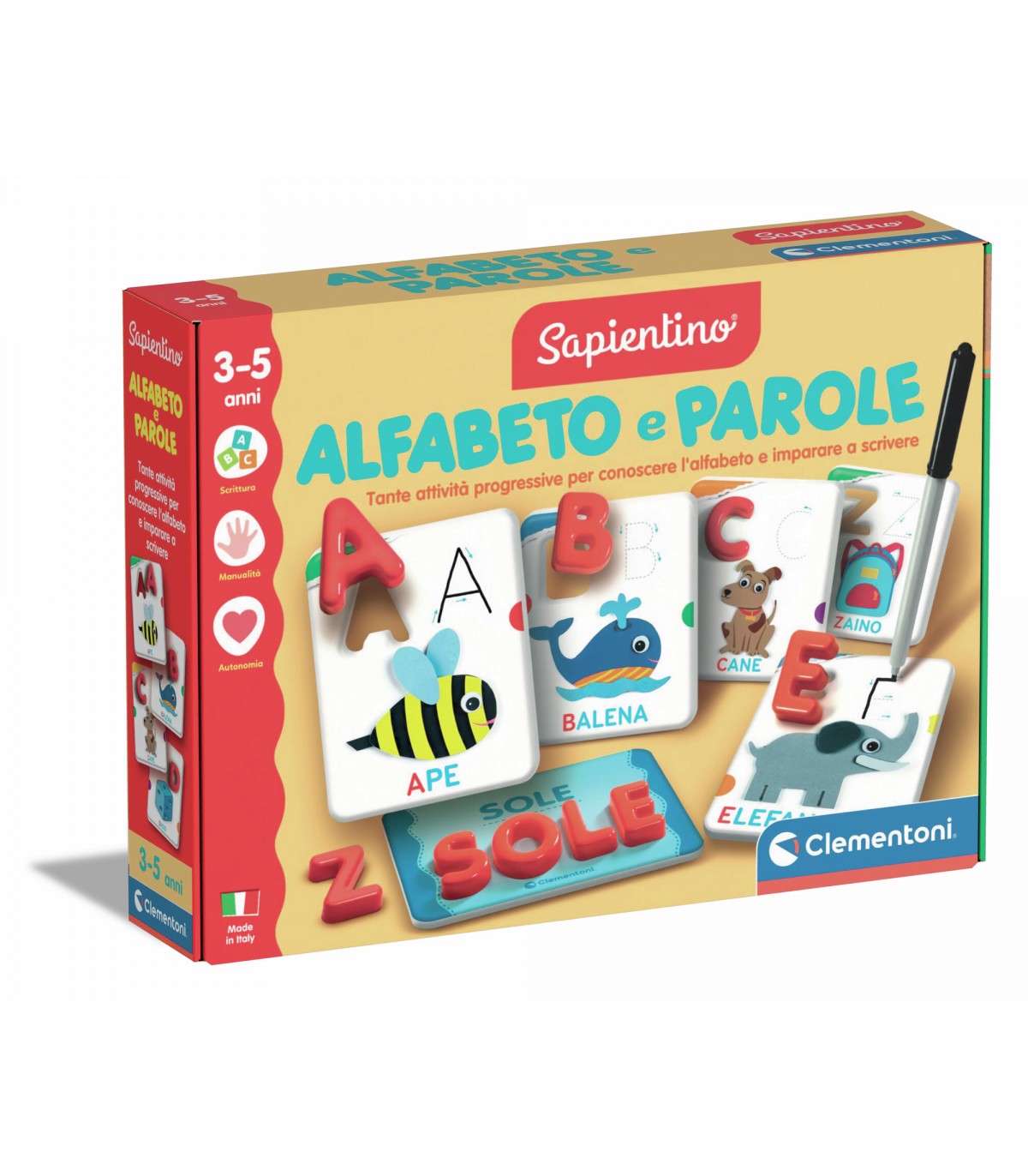 Scopri il mondo dell'alfabeto con Sapientino - Alfabeto e Parole, un gioco educativo pensato per i bambini a partire dai 3 anni. Questo kit coinvolgente include 26 lettere in plastica e altrettante in cartone, perfette per un apprendimento ludico e creativo. I piccoli potranno esplorare le lettere attraverso immagini colorate e utilizzare un pennarello cancellabile per esercitarsi nella scrittura con la tecnica del ricalco. Le grandi tessere illustrate e il pratico paroliere stimolano la curiosità e rendono facile e divertente comporre le prime parole. Sapientino trasforma l'apprendimento in un'avventura, regalando ai bambini la gioia di scoprire la magia delle lettere e delle parole. Un investimento nel futuro dei tuoi piccoli, che stimola la loro creatività e abilità linguistiche. Non