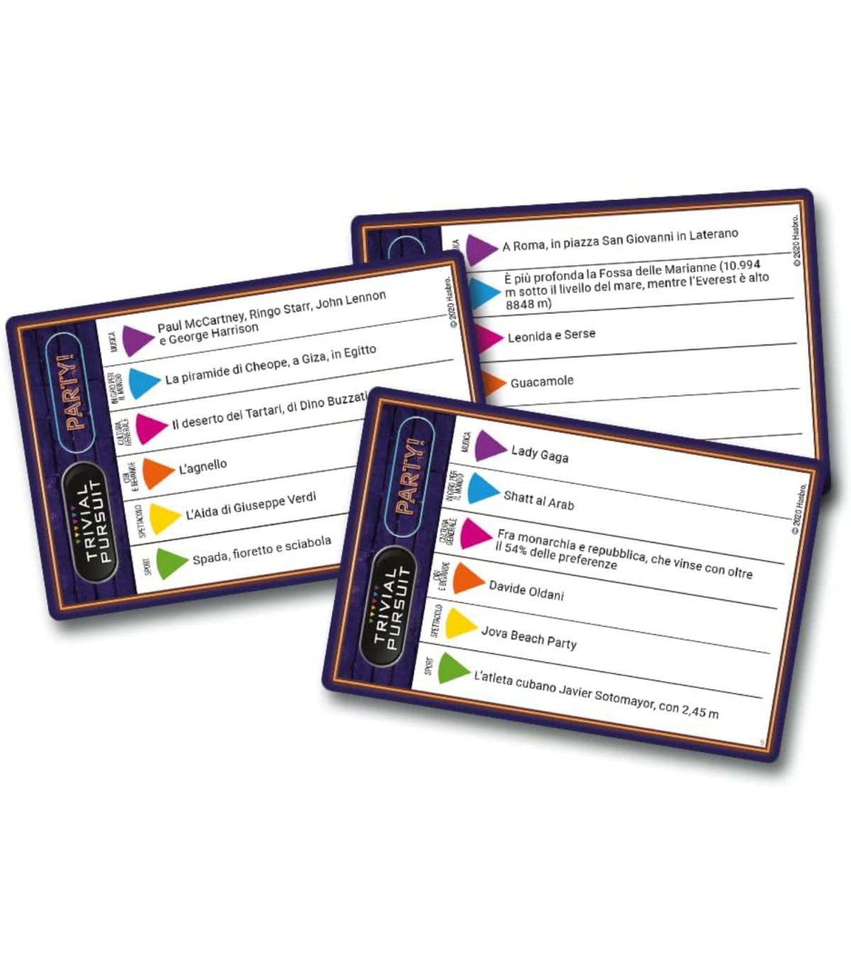 Il modo migliore per movimentare una festa! Metti alla prova le tue conoscenze in questa edizione unica di TRIVIAL PURSUIT: Party! Puoi scegliere tra 600 domande divise in 6 categorie: In giro per il Mondo, Spettacolo, Musica, Cibi e Bevande, Cultura Generale e Sport.