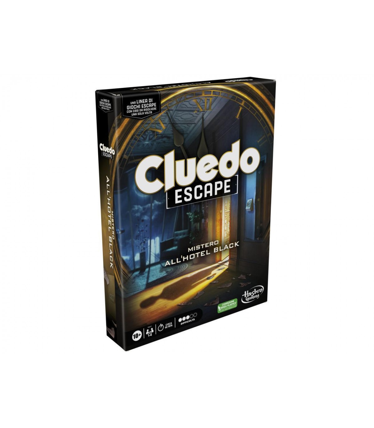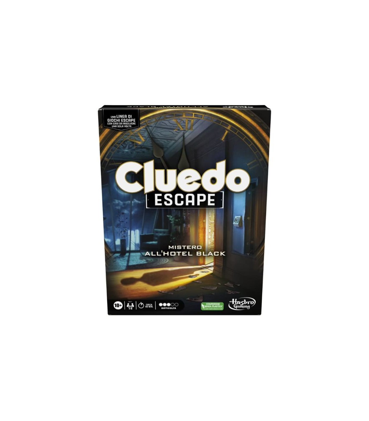 Dopo l'omicidio del Dottor Black a Villa Tudor, tu e gli altri ospiti siete stati invitati all'Hotel Black per una commemorazione in suo onore. Una volta lì, scoprite che i documenti compromettenti che ha raccolto su di voi esistono ancora. Uno di voi tenta dunque di rubarli! I giocatori devono ora scoprire CHI ha tentato di appropriarsi dei dossier, DOVE sono tenuti e QUALE È la password per accedervi. Il gioco Cluedo Escape: Mistero all'Hotel Black combina il mistero e i personaggi del classico Cluedo con un'esperienza di gioco in versione escape room che ti permette di cominciare subito a giocare grazie alla preparazione semplificata. I giocatori muovono le pedine su un tabellone in 3D che si compone man mano che ogni singola stanza viene scoperta mentre pescano carte, risolvono puzzle, sbloccano nuove stanze e svelano indizi. Dopo essere riusciti a fuggire dall'hotel, i giocatori riesaminano gli indizi raccolti e sfruttano le loro capacità deduttive per formulare l'accusa correttae