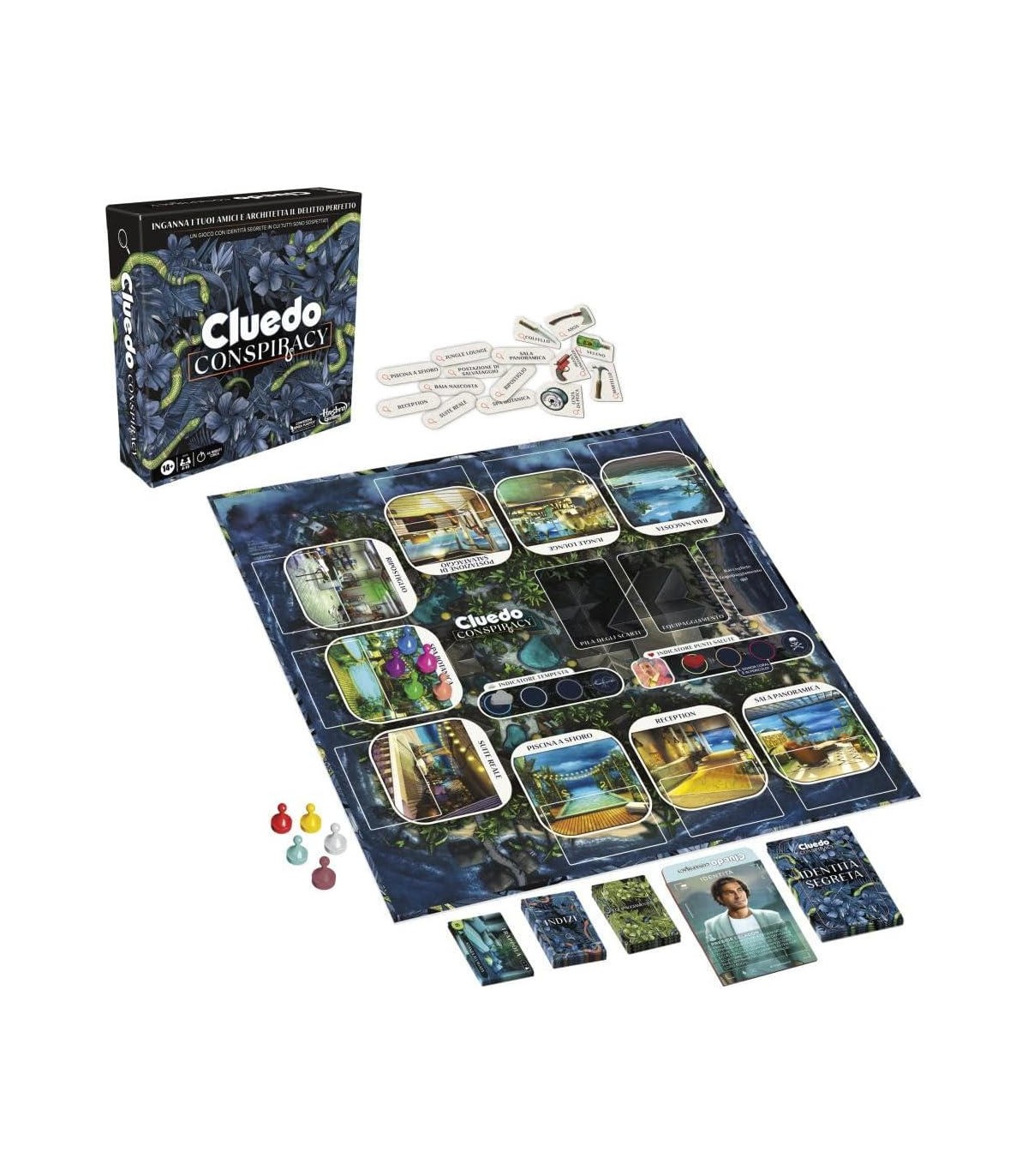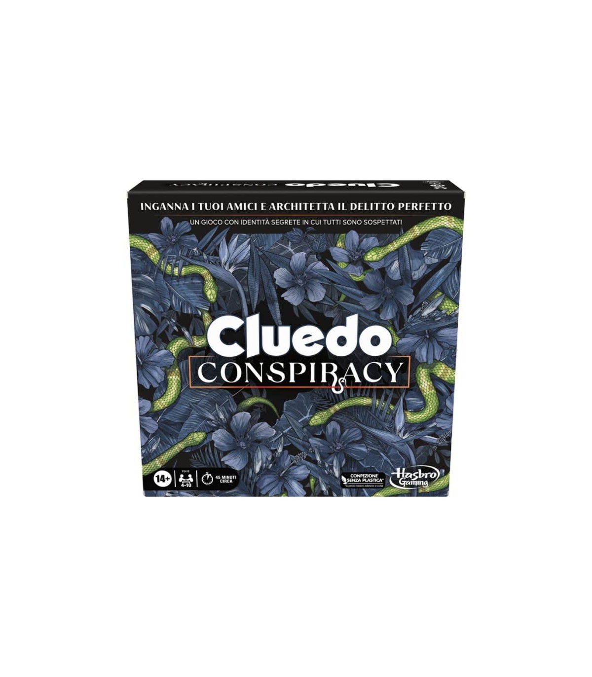 Cluedo Conspiracy è un gioco da tavolo investigativo giocabile in 4-10 giocatori. La durata di una partita è di circa 45 minuti ed è consigliato ad un pubblico di almeno 14 anni.Un gioco di ruoli segreti dove tutti sono sospettati!In questo gioco di ruolo e deduzione, riuscirete a salvare il Signor Coral dai cospiratori che cercano di ucciderlo o sarete più furbi degli investigatori e commetterete l'omicidio facendola franca?Il gioco da tavolo Cluedo Conspiracy è un gioco con identità segrete in cui tutti sono sospettati! Come ospite del lussuoso Resort Vipera nera, scopri che qualcuno (forse proprio tu!) vuole uccidere il manager, il Signor Coral. Una serie di trappole mortali sono state posizionate in tutto il resort e qualcuno è armato! Ora devi risolvere il mistero più importante: di chi ti puoi fidare? In questo gioco strategico di inganni e deduzioni, nei panni dei personaggi di Cluedo, i giocatori assumono identità segrete e sono divisi in due squadre avversarie: gli Alleati