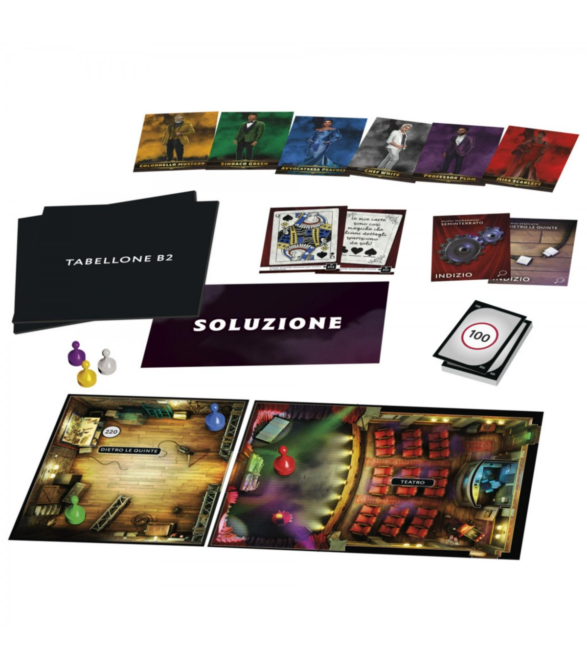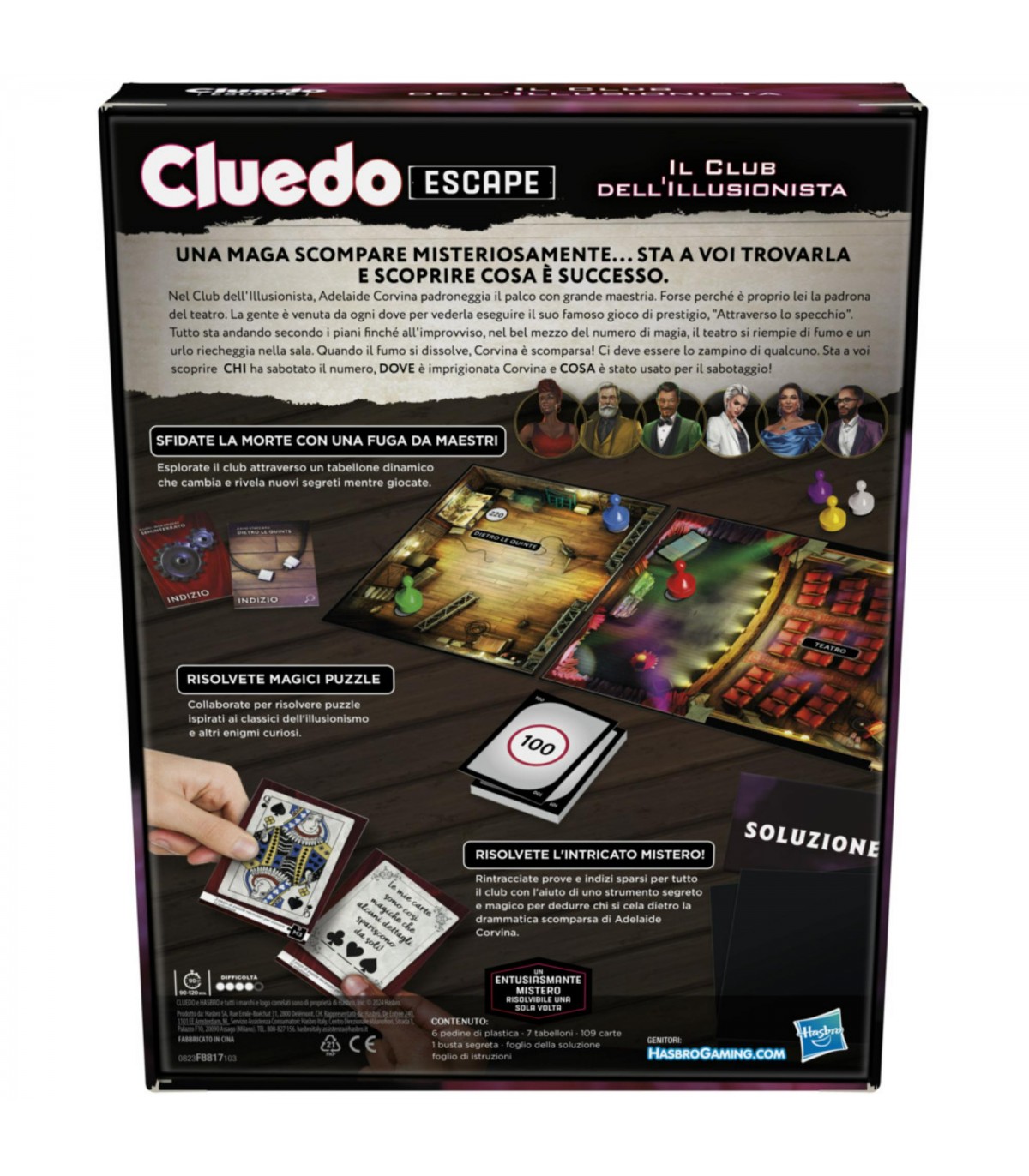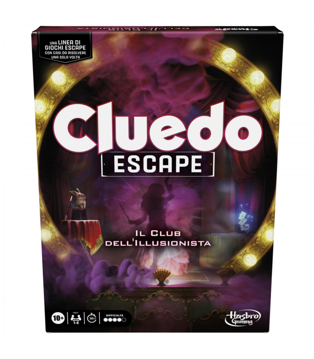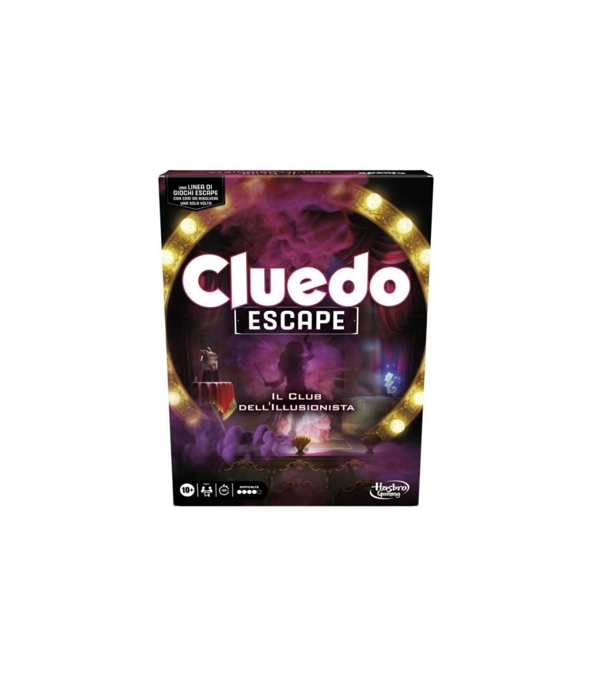 Quando una famosa maga scompare, si scatena il finimondo per ritrovarla! Adelaide Corvina sta eseguendo l'illusione Attraverso lo Specchio, quando il teatro si riempie di fumo e si sente un urlo. Corvina è sparita! Ora i giocatori devono fuggire dal club di magia e risolvere il mistero nel gioco Cluedo Escape: Club dell'Illusionista! Scopri CHI l'ha sabotata, DOVE è tenuta prigioniera e COSA è stato usato per far fallire il trucco. Questo gioco combina il mistero e i personaggi del classico Cluedo con un'esperienza di gioco in versione Escape Room che ti permette di cominciare subito a giocare grazie alla preparazione semplificata. I giocatori muovono le pedine su un tabellone che si compone man mano che ogni singola stanza viene scoperta mentre pescano carte, risolvono puzzle, sbloccano nuove stanze e svelano indizi. Dopo essere riusciti a fuggire dal club, i giocatori riesaminano gli indizi raccolti e sfruttano le loro capacità deduttive per formulare l'accusa corretta e vincere!