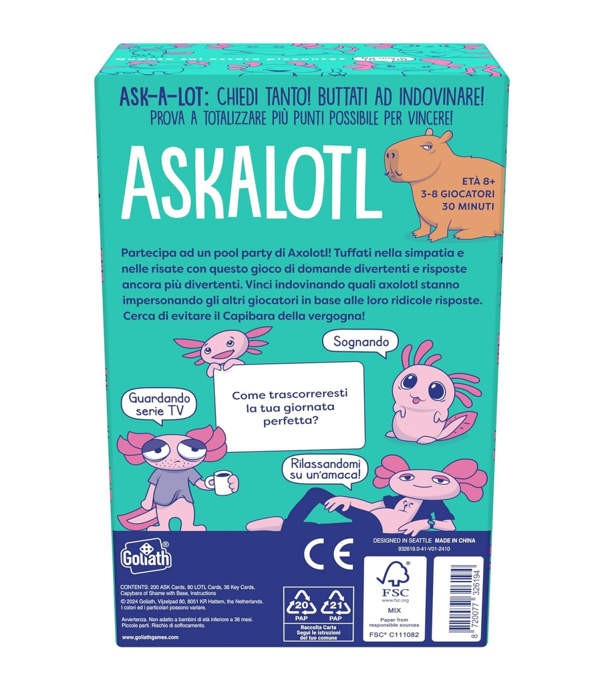 Concludendo, scegliere Ask Alotl significa investire in momenti di puro divertimento e connessione. Non perdere l'occasione di arricchire le tue serate con un gioco che promette risate e interazione, rendendo ogni incontro unico e memorabile. Fai spazio sulla tua mensola dei giochi e preparati a vivere esperienze che rimarranno impresse nella memoria di tutti.