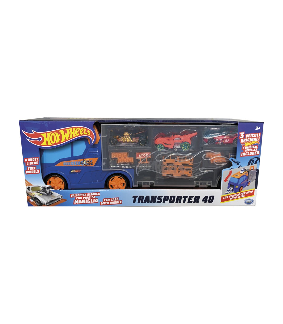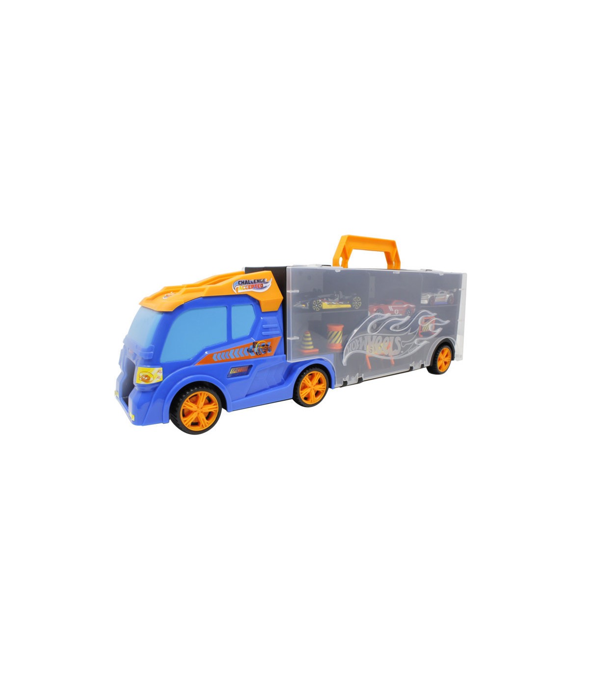 Hot Wheels - Transporter cm 40 NEW con 3 auto e accessoriScivolo frontale, segnali stradaliapribile su due lati, può contenere