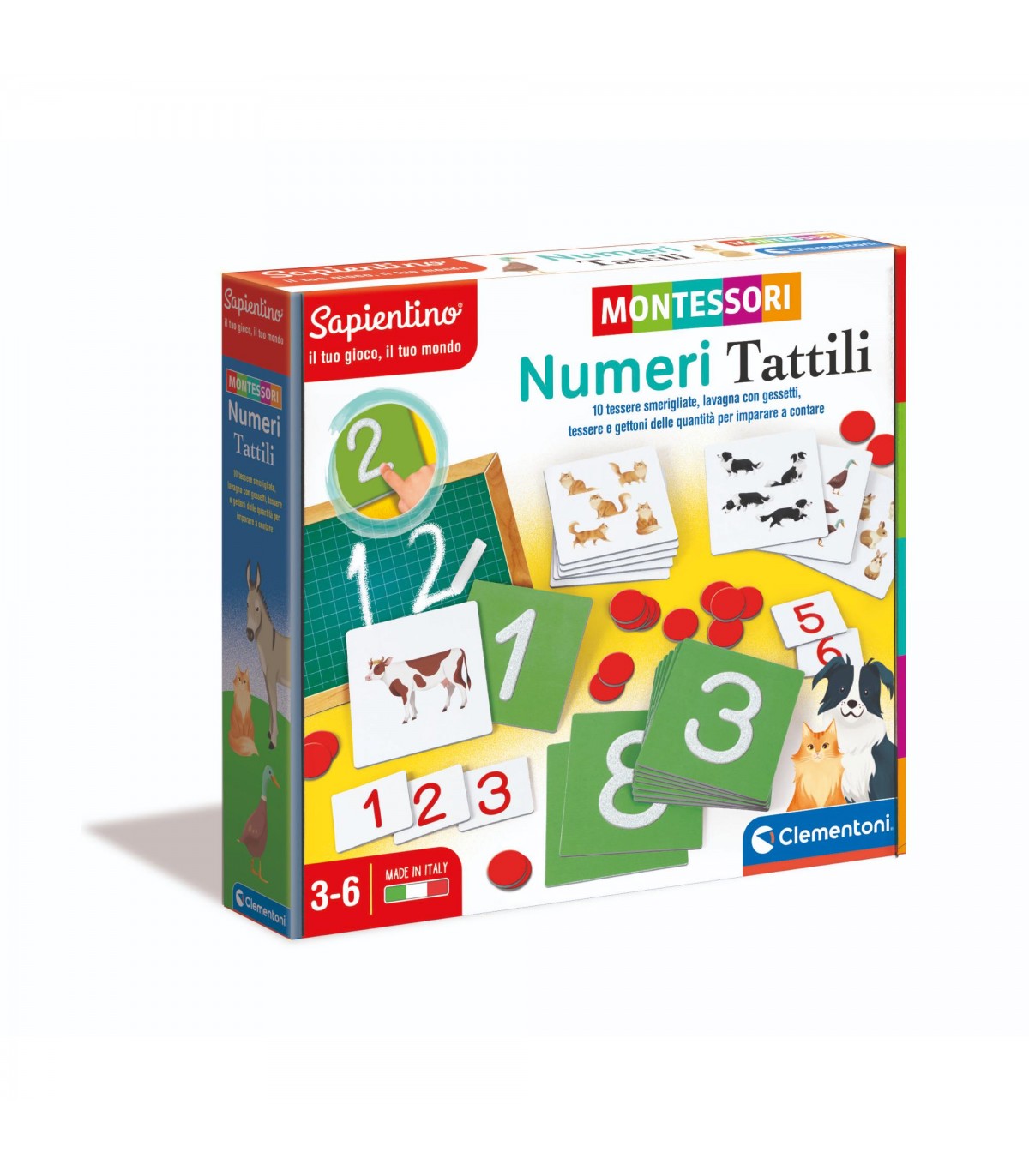 Un gioco basato sulla percezione tattile, per aiutare il bambino a conoscere i numeri secondo il metodo Montessori. Contiene 10 tessere delle cifre smerigliate, ovvero con una speciale finitura ruvida da toccare per memorizzarne la forma. Inoltre, il gioco stimola il pensiero numerico grazie all'abbinamento tra i numeri e le tessere quantità e ai gettoni del pari e dispari. Il bambino attraverso il tatto impara inizialmente a riconoscere la forma dei numeri e poi sviluppa la capacità di associazione abbinandoli alle tessere quantità e ai gettoni.