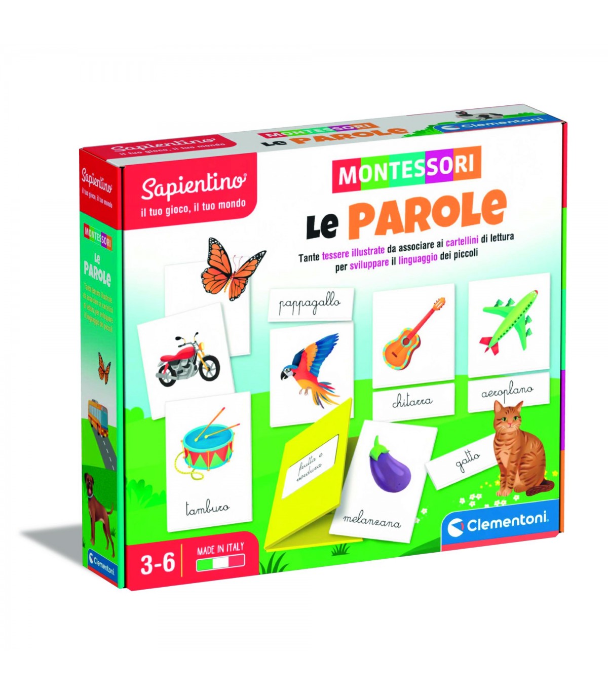 Questo gioco, ispirato all'attività montessoriana della nomenclatura, invita il bambino ad abbinare le tessere con le immagini a quelle con le parole corrispondenti. L'obiettivo è quello di stimolare lo sviluppo del lessico in modo naturale e spontaneo, nonché di allenare le capacità logiche e di osservazione. Contiene anche delle cartelline di cartoncino per classificare le parole in base ai contesti di appartenenza: animali, strumenti musicali, frutta e verdura, mezzi di trasporto. Ideato, progettato e sviluppato in Italia.