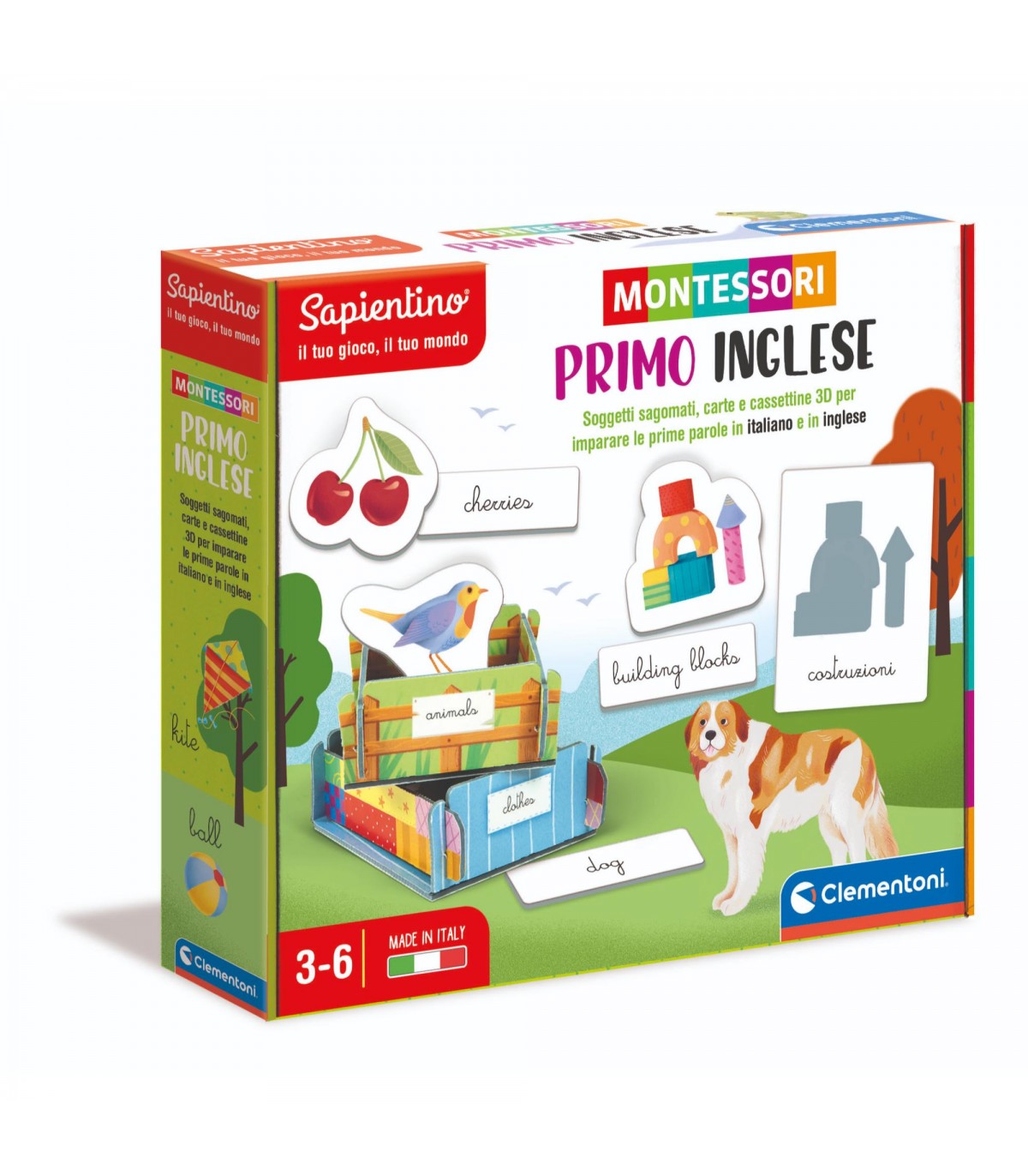 Un gioco originale per apprendere le prime parole in inglese secondo la pedagogia Montessori. Contiene: 24 oggetti sagomati, 24 carte double face con i nomi in italiano e inglese, 24 cartellini inglesi e 4 cassettine da assemblare per classificare gli oggetti in categorie. Il bambino sarà invitato prima a classificare gli oggetti nelle cassettine, poi ad appaiare l'oggetto al nome italiano, infine ad abbinarlo al nome inglese, aiutandosi con il retro delle carte. Il manuale incluso nel gioco suggerisce anche come ascoltare la corretta pronuncia inglese delle parole usando strumenti gratuiti online.
