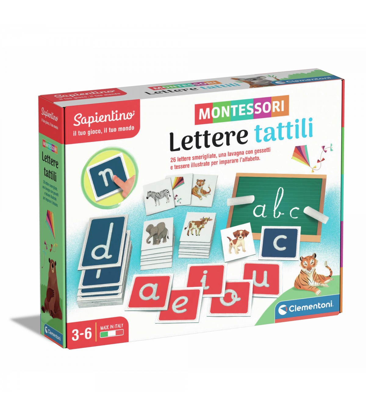Questo kit contiene 26 tessere con le lettere smerigliate, una speciale finitura ruvida al tatto: il bambino tocca la superficie delle lettere e ne memorizza la forma. Il gioco contiene anche una lavagnetta per scrivere con i gessetti e le tessere delle parole da associare alle iniziali. Un gioco pensato per apprendere l'alfabeto in modo semplice e naturale secondo il metodo Montessori. Stimola le capacità visive, tattili e di osservazione.