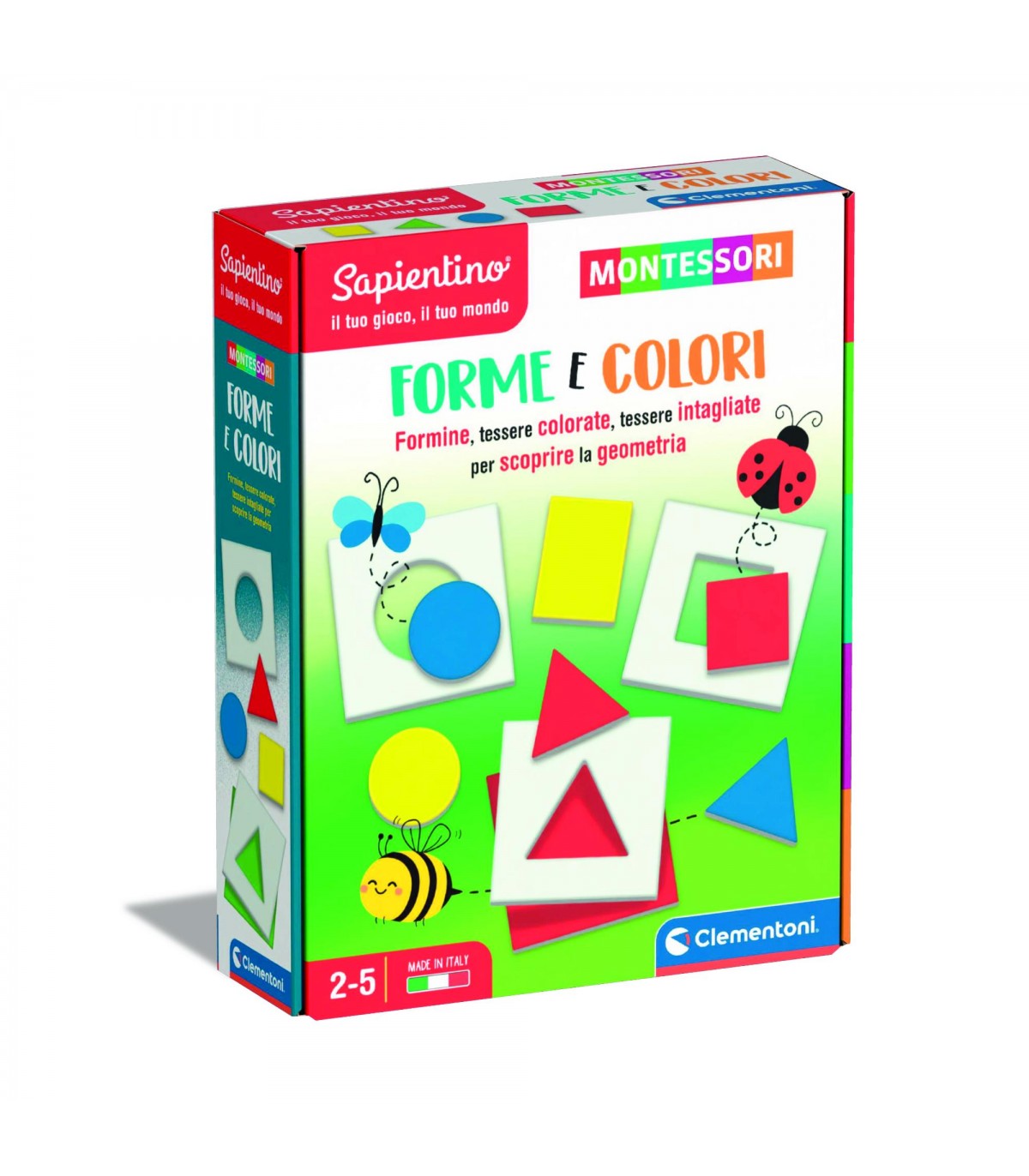 Un gioco educativo Montessori pensato per i più piccoli e basato sui colori primari, secondari e su forme geometriche semplici, per stimolare il pensiero logico-matematico fin dai primi anni.  Il bambino deve riconoscere e sovrapporre le tessere intagliate alle tessere colore corrispondenti e associare la formina corrispondente.  Inoltre, con i mini puzzle incastra le formine geometriche intagliate, in cartone spesso, negli incavi giusti, allenando così la manualità. Tante attività per conoscere forme e colori attraverso l'osservazione e la sperimentazione manuale. I materiali sono robusti e dai colori vivaci, adatti a catturare l'interesse dei piccoli. La confezione ed i materiali di gioco sono studiati per favorire l'autonomia del bambino, l'ordine mentale e visuo-spaziale. La guida inclusa suggerisce tante attività basate sulla pedagogia Montessori che sviluppano osservazione, concentrazione e manualità. Un gioco educativo prescolare Sapientino per bambini dai 2 ai 5 anni. Made in Italy.
