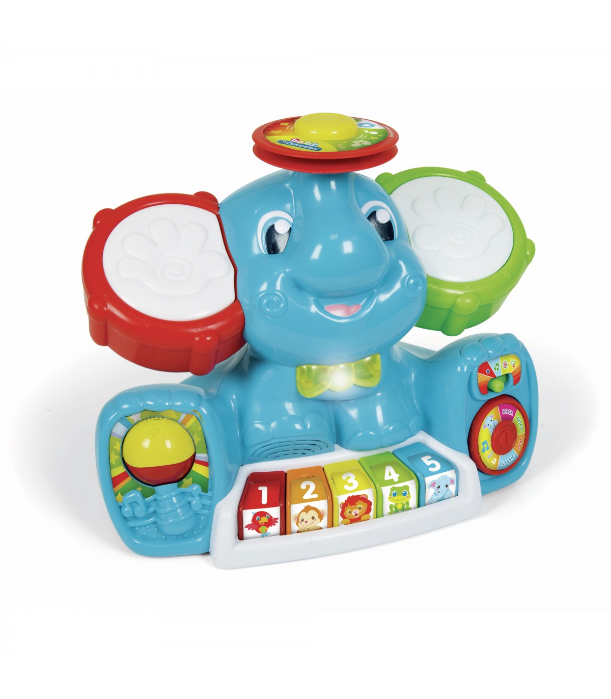 Questo divertente centro attività musicale ricco di canzoni, melodie, suoni e strumenti, appositamente studiato per introdurre il bambino nel mondo della musica. Il simpatico elefantino in concerto ha due grandi orecchie tamburo, una colorata tastiera, due piatti, una maracas meccanica e un papillon che si illumina. Inoltre è possibile divertirsi con 3 modalità di gioco: apprendimento, inglese, musica. Insegna le prime lettere, i numeri, i colori, gli animali e i loro versi. Riproduce 4 generi musicali: classica, pop, disco e rock ed è possibile suonare con 16 strumenti diversi. A seconda del genere musicale la tastiera, i piatti e i 2 tamburi sulle orecchie cambiano il suono dello strumento. Stimola lo sviluppo della manualità, della percezione uditiva e visiva. Favorisce il rapporto causa effetto e contribuisce allo sviluppo del linguaggio. Il bambino approccia alla musica in modo semplice e divertente stimolando la fantasia e l'emotività. Una maracas meccanica, un selettore musicale ed i piatti permetteranno una completa interattività del bambino con il gioco.