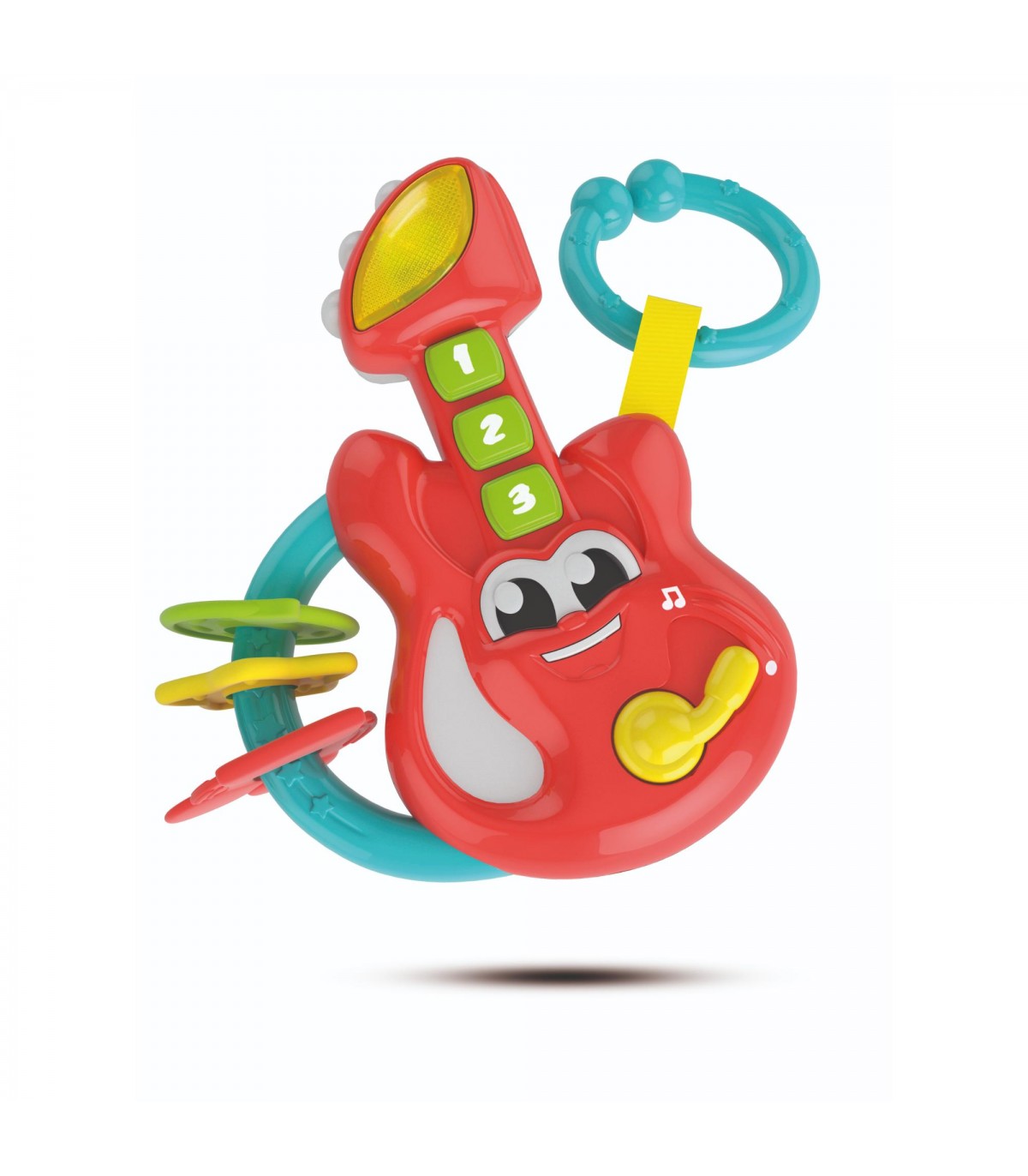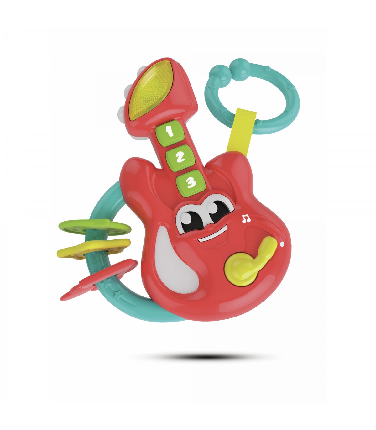 Un sonaglino perfetto per i piccoli musicisti di domani! Questa simpatica chitarra con 3 tastoni in gomma farà divertire il bambino suonando divertenti melodie, e lo porterà alla scoperta dei primi numeri con tante musichette. Con 3 pendagli in morbida gomma da mordicchiare, perfetti per la fase della dentizione e un pratico gancio per appendere il sonaglino. Stimola la manualità e la percezione uditiva dei più piccoli.