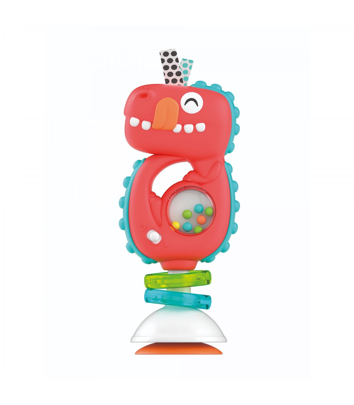 Un simpatico sonaglino a forma di dinosauro per intrattenere il bambino anche nel momento della pappa. Muovendo il sonaglino si attiveranno simpatiche melodie ed effetti sonori, mentre le palline colorate e i ciondoli attireranno l'attenzione del bambino stimolando la percezione tattile. Con pratica ventosa per tenere il sonaglino stabile su tavolo o seggiolone durante la pappa.