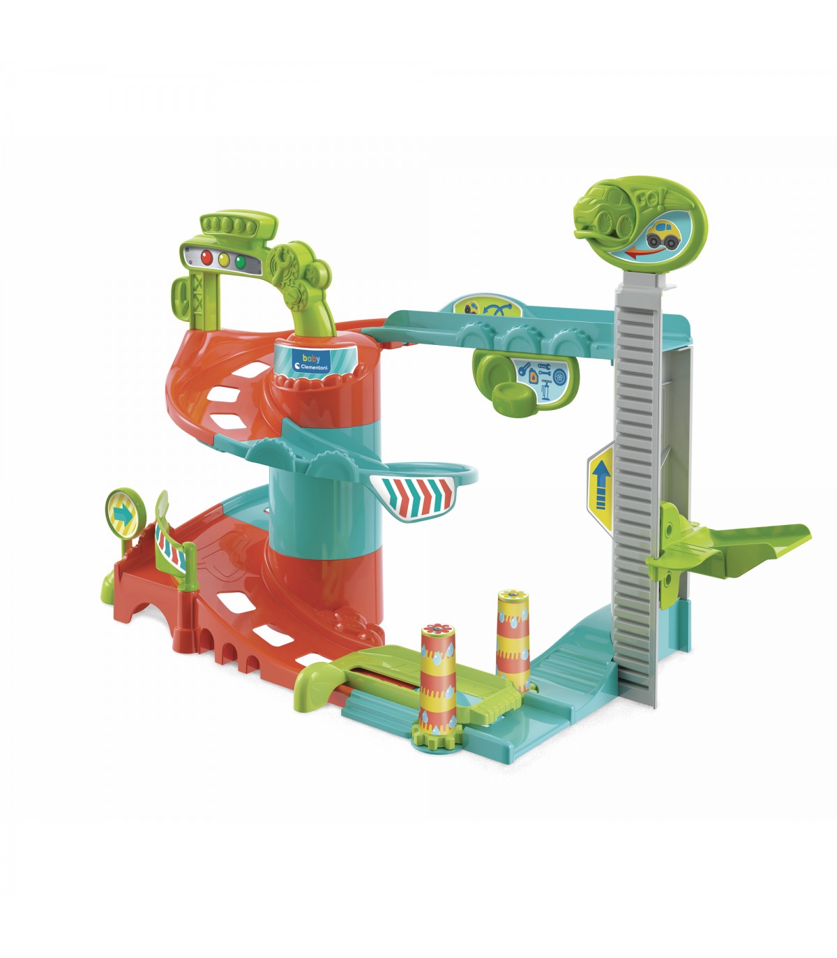 Un garage ricco di attività meccaniche per far scivolare la macchinina lungo il percorso, risalire, riscendere e non smettere mai di divertirsi! La macchinina incluse nel gioco lungo la discesa si ribalta facendo delle divertentissime capriole, stimolando la curiosità del bambino. Con un sistema di risalita manuale è possibile riportare la macchinina all'inizio del percorso, come in un vero garage! Lungo il percorso è possibile azionare dei passaggi a livello, fermarsi a fare rifornimento e passare attraverso i rulli dell'autolavaggio. Le attività meccaniche sono pensate per sviluppare la manualità e la percezione tattile dei più piccoli.